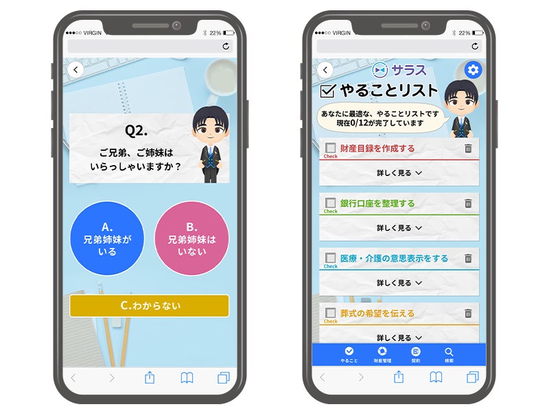 やることリストに記載された財産目録の作成や各種契約書の作成、残される家族へのメッセージなどの対策に対応したサラスのサービス・機能へ誘導して、相談から対策までをスマホ上でワンストップ完結できるようナビゲートします。