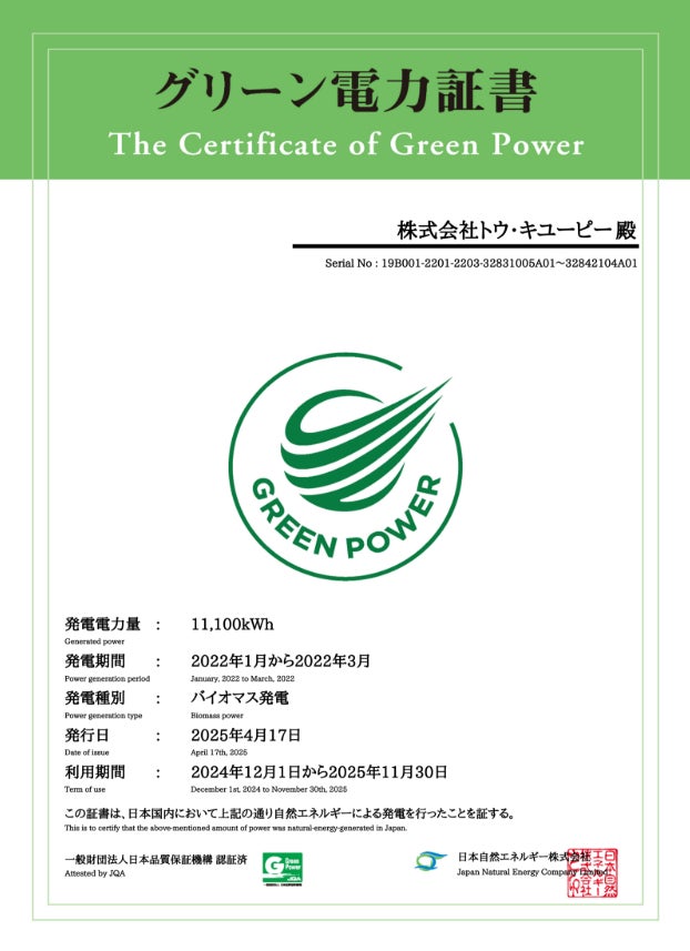 キユーピー株式会社のグループ会社で、キユーピーウエルネスを運営する株式会社トウ・キユーピー(本社:東京都渋谷区、代表取締役社長:谷川和正)は、2025年4月17日付でグリーン電力証書を取得し、本社オフィスにおける使用電力を再生可能エネルギー由来の電力に切り替えました。これにより、オフィス移転時の2023年度から比較して電力使用に伴うCO₂(二酸化炭素)排出量と比較して、実質40%の削減の目標を達成しました。