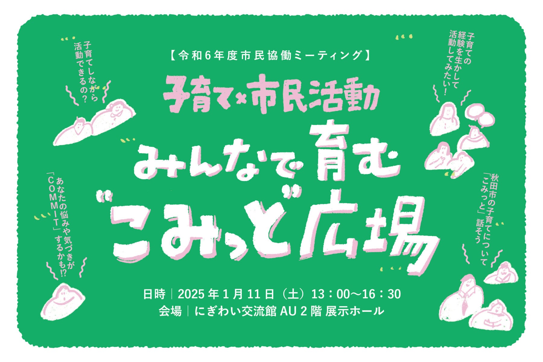 子育てをテーマにした活動に取り組む団体や個人が集い考えるミーティング「子育て×市民活動 みんなで育む"こみっと"広場」を1月11日(土)に秋田市にぎわい交流館(秋田市中通)で開催します。