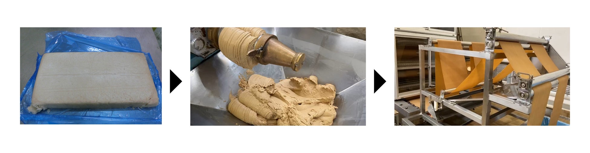 魚肉のすり身に調味料を配合しながら練り、シート状に成型したお魚のシートをビッグカツの肉と呼んでいます。このビッグカツの肉に衣をつけ、パン粉をまぶして揚げてビッグカツを製造しています。