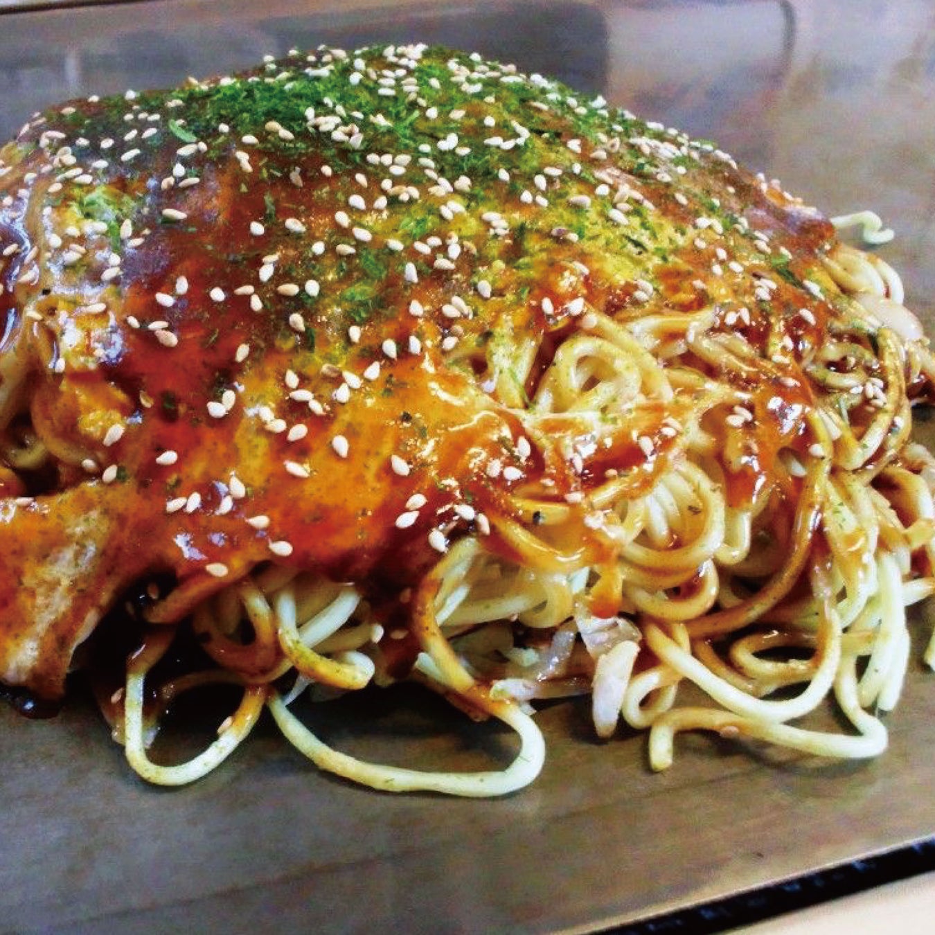 キャベツたっぷり重ね焼き。甘いソースが食欲そそる!鉄板でアツアツをご提供。本場広島のお好み焼きご堪能あれ!