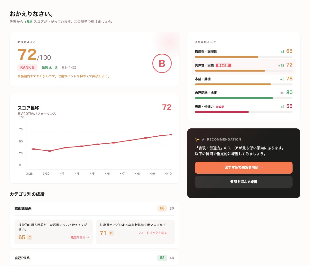 質問カテゴリ(技術課題・自己PR・志望動機・行動特性・自己紹介)ごとの成績を一覧で確認できます。