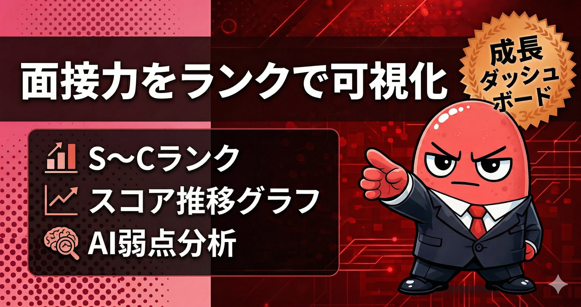 競技プログラミングのレーティングやゲームのランクシステムと同じ感覚で、面接力の向上を実感できます。