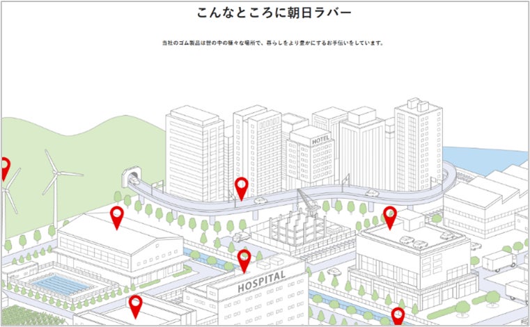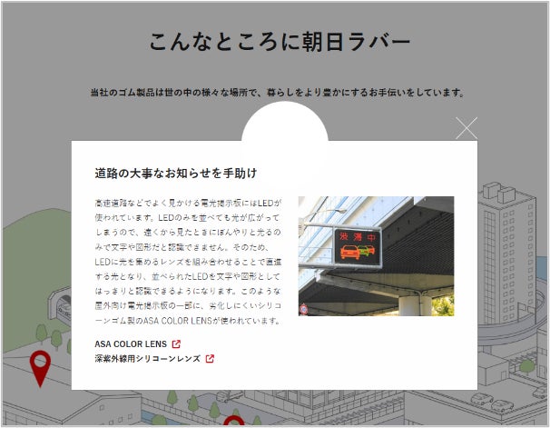 街のイラストから、朝日ラバーが製造する普段目に見えない部品が日常生活のどこに使われているかを説明するコンテンツを新たに追加しました。赤色のピンをクリックすると、製品の特長や使われ方などの説明が出てきます。こちらから使用している製品情報へダイレクトに遷移することもできます。