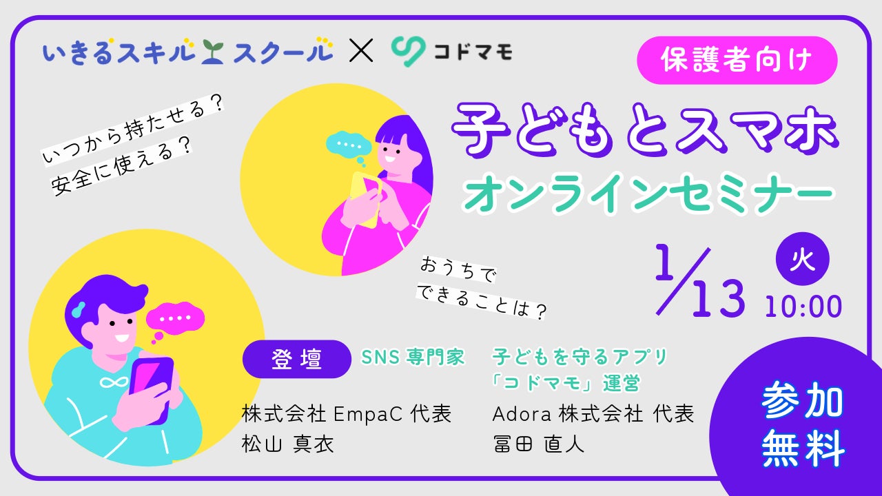 そして、「いきるスキル・スクール」の公開を記念して、子どもとスマホの付き合い方をテーマにした 無料オンラインセミナー を1月13日(火)に開催いたします。