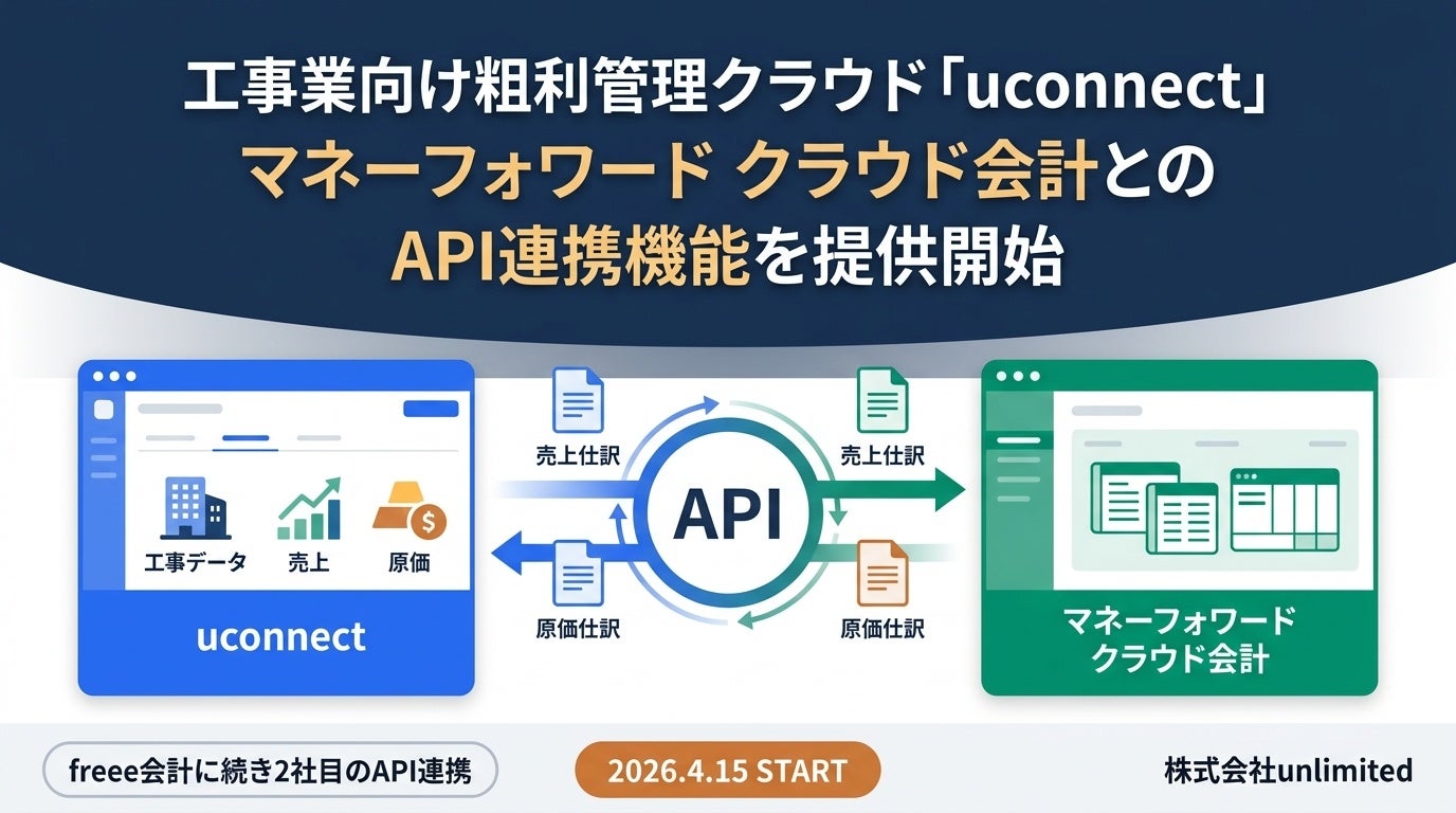株式会社unlimited(本社:山口県周南市、代表取締役:橘貴督、以下「unlimited」)は、2026年4月15日(水)より、工事業向け粗利管理クラウドソフト「uconnect」(ユーコネクト)において、「マネーフォワード クラウド会計」とのAPI連携機能の提供を開始いたします。本機能により、「uconnect」で管理する売上・原価の仕訳データを「マネーフォワード クラウド会計」へワンクリックで連携でき、工事会社の経理業務における二重入力を解消します。