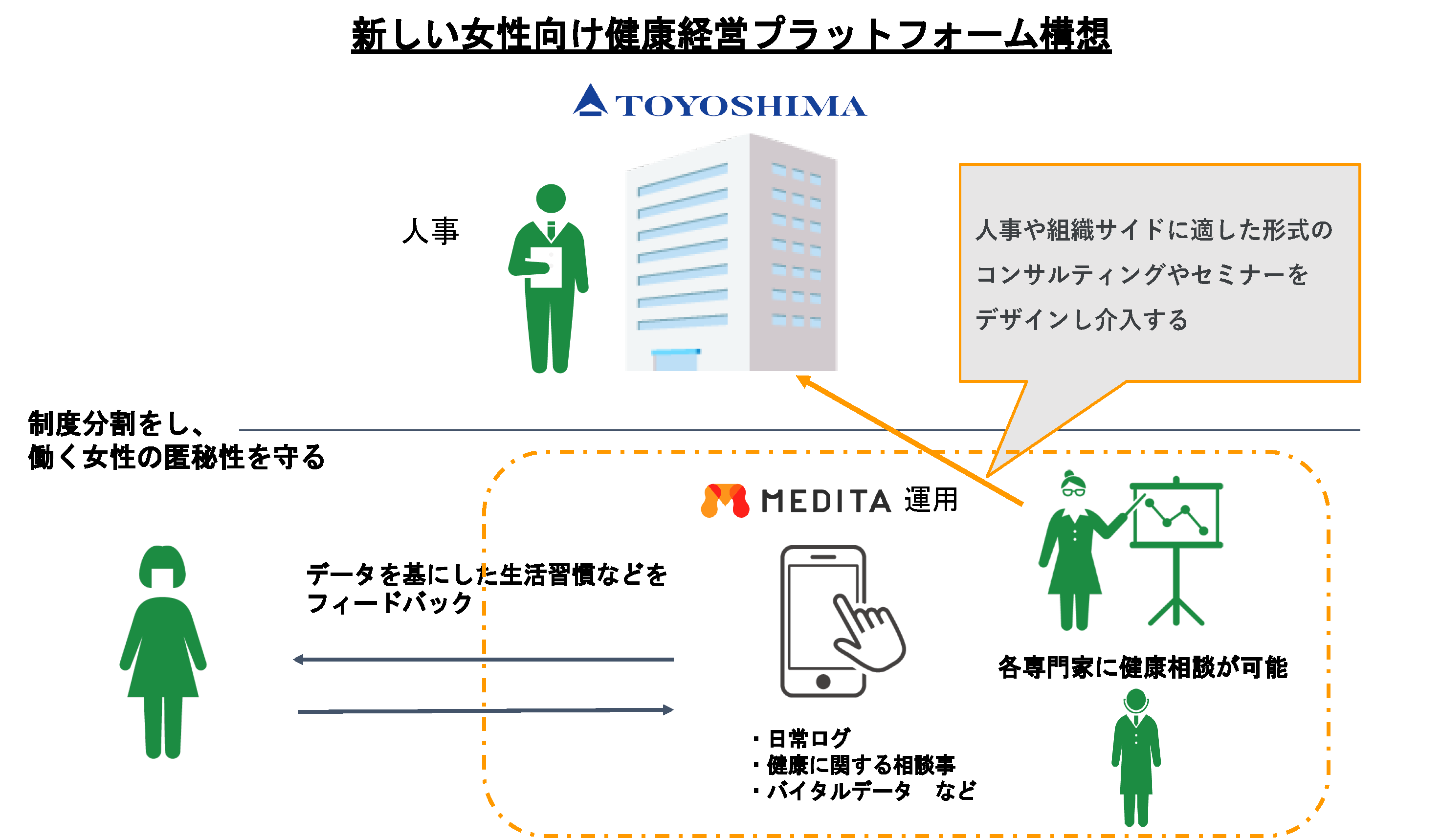 健康経営の導入が定着する中、女性従業員の約5割が女性特有の健康課題などにより職場で困った経験があるという声が上がる一方で、職場の管理者がその対処に困ってしまったという状況が約4割あるという調査結果※が報告されています。現状、女性従業員も自身の女性特有の健康状態に関して、職場の上司や会社に相談しづらいという背景があります。そこで、豊島株式会社の女性従業員のみなさまにご協力いただき、被験者の健康課題等の秘匿性を守りながら、MEDITAが自社開発中のウェアラブルデバイスで取得可能なバイタルデータを含む複合情報を基に、生活習慣等へのフィードバックを実施するなど、女性向けの新しい健康経営プラットフォーム構想に向けたPoCを2022年6月よりスタートいたします。