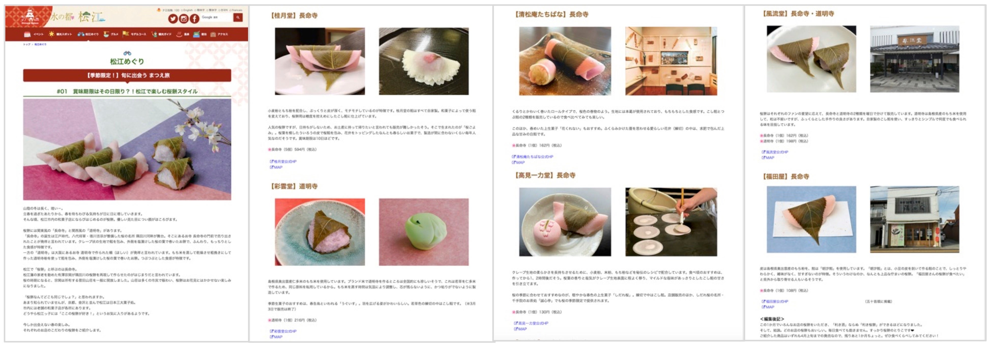 松江観光協会WEBサイト「【季節限定!】旬に出会う まつえ旅 #01賞味期限はその日限り?!松江で楽しむ桜餅スタイル」:https://www.kankou-matsue.jp/omoshiro/season