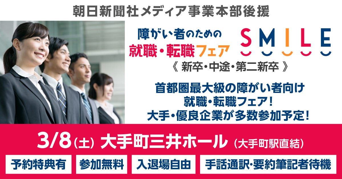 ≪朝日新聞社メディア事業本部後援≫3/8(土)障がい者のための就職・転職フェアSMILE★東京・大手町にて開催!【2026新卒/2025新卒・第2新卒・中途対象】大手優良企業28社が参加
