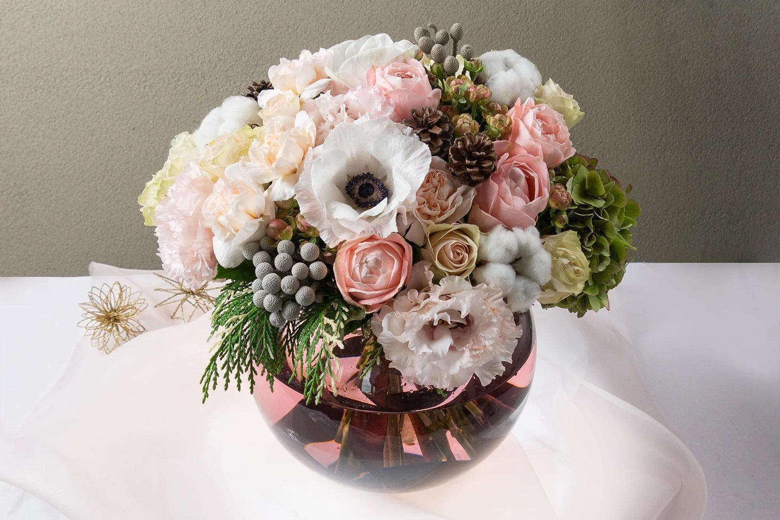 コットンフラワーや松かさでクリスマスの雰囲気を出した、柔らかく優しい印象のブーケです。