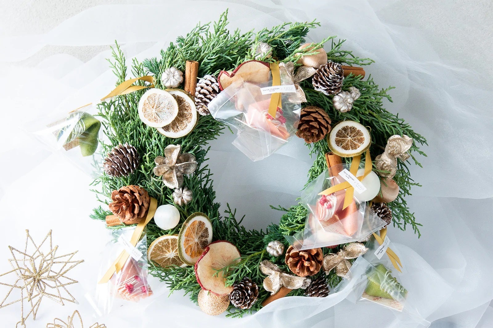 ナチュラルで香り高いリースに合わせるのは、エルベ・シャトランのブティックを彩る花々の華やかなピンクと、中山豊光オーナーシェフの故郷、九州産の八女茶の緑をモチーフにしたフォーチュンクッキー。中には二人がいるパリからのメッセージ(おみくじ)が入っています。フォーチュンクッキーと共にリースを飾るオーナメントは、ドライフルーツやスパイス・木の実などのナチュラルな素材をセレクト。ご自身でデコレーションをお楽しみいただけるDIYと、プロによる完成品からお選びいただけます。