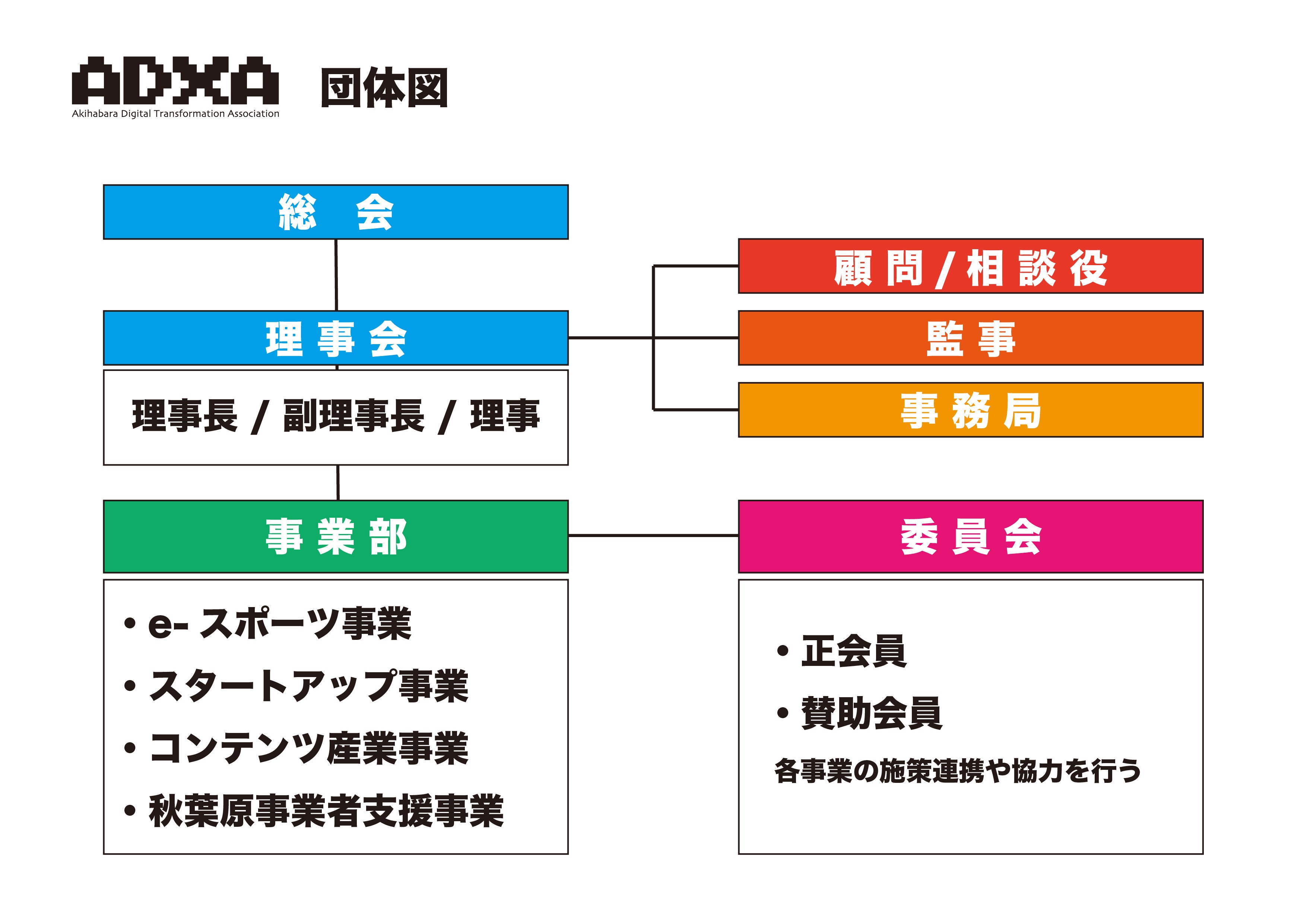 各参画企業が事業主体者となり「e-スポーツ事業」「スタートアップ事業」「コンテンツ産業事業」「秋葉原事業者支援事業」といった千代田区商工業進行基本計画のサポート及び秋葉原事業者の支援事業を行う事業部を設置し、その他下記事業の施策連携や協力を行う「正会員」と「賛助会員」を募ります。