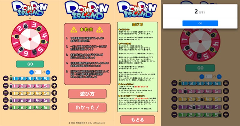 インストール不要でアクセスするだけですぐにプレイを開始できるWEBアプリ「ドンペンアイランドWEBアプリ」も同時に登場。「遊び方」ページでプレイマニュアルを確認でき、前述の通りルーレット機能やカウンターが実装されているため持ち運びの場所をとらずスマートフォン1台で対応可能となっています。