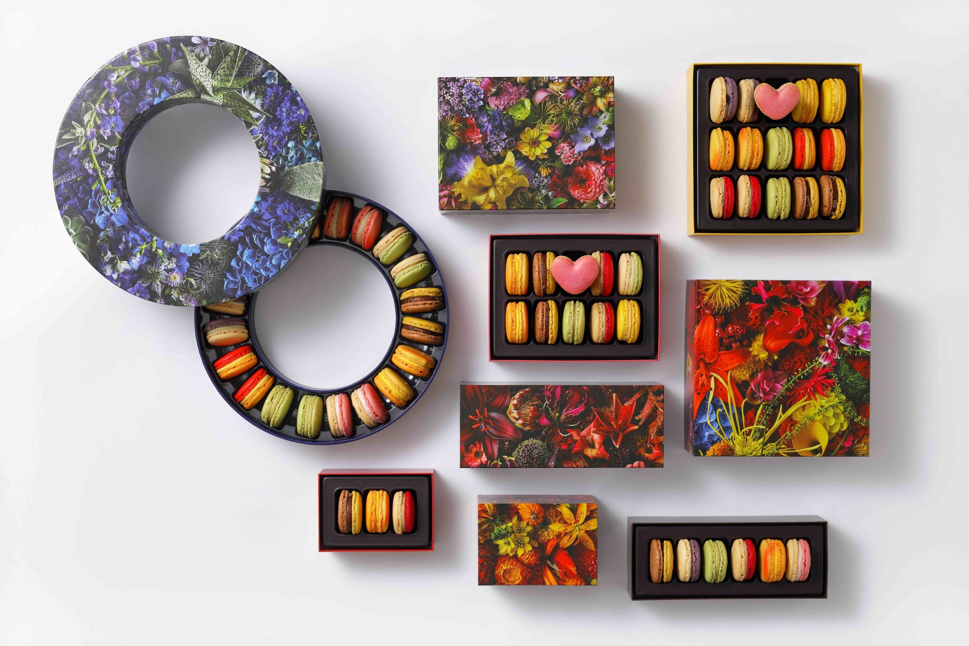 [ FLOWER POWER(花の持つ無限の力)]をテーマに、東さんがピエール・エルメのために制作したアレンジメントを施した限定BOXに、メゾンを代表するマカロンを詰め合わせた、華やかなコレクションをご用意しました。
