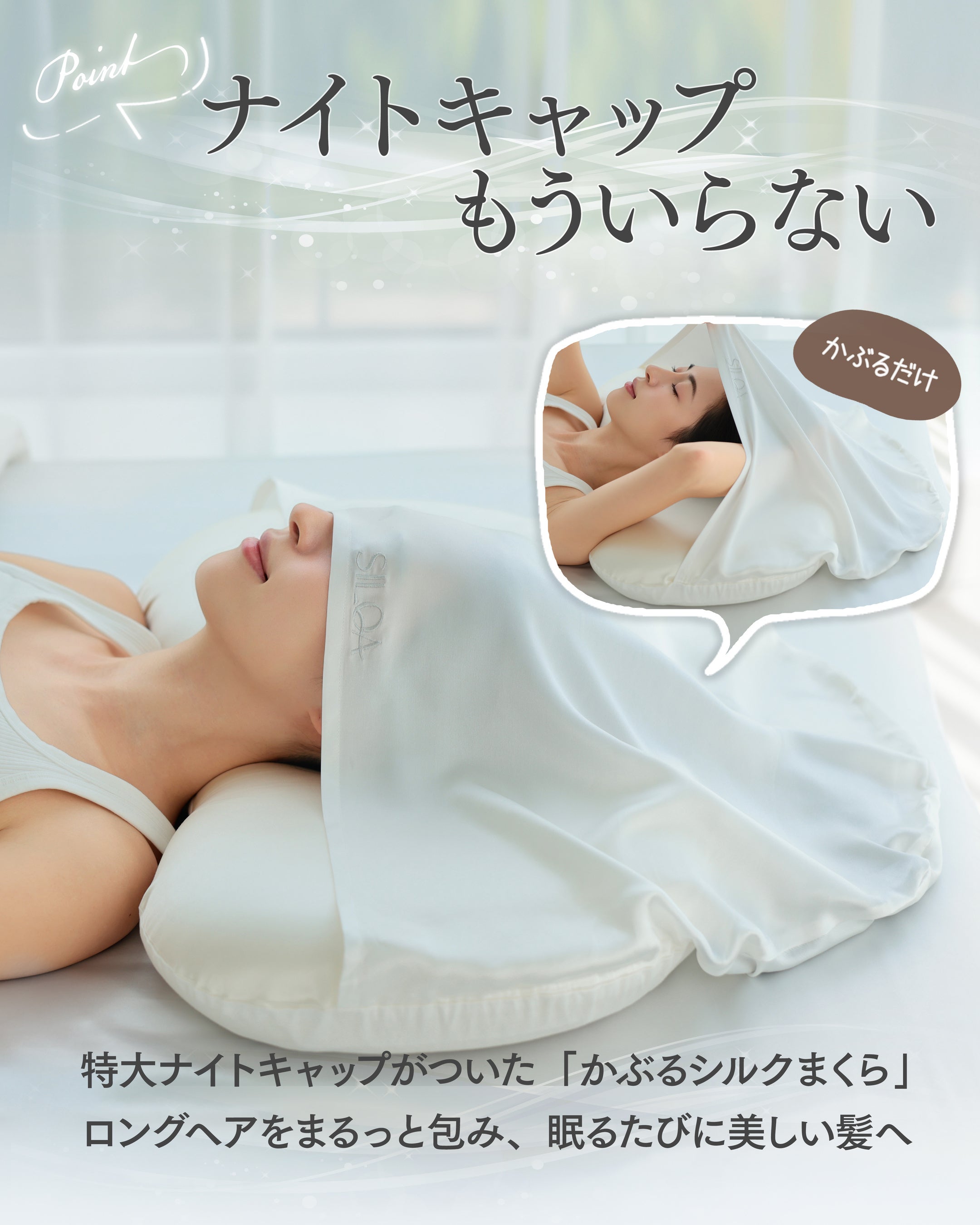 メイン機能は、SNSでも話題になった「巨大なシルクフード」。ナイトルーティンで仕上げた髪をシルクで丁寧に包み、摩擦や乾燥から保護します。一般的なシルクの枕カバーで発生する「ロングヘアがはみ出す」問題も、このシルクフードがあれば解決できます。