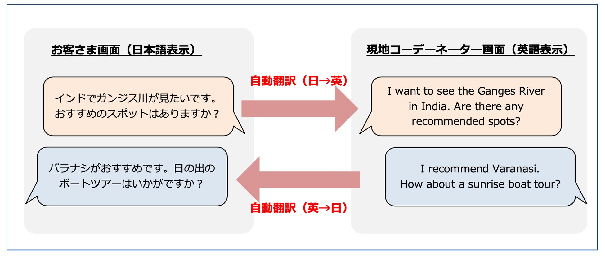 新たにリリースされた「AI翻訳機能」により、日本語を話す旅行者が英語を使う現地コーディネーターとスムーズなやり取りが可能となります。これまでの海外旅行予約では、言葉の壁が大きな障害となり、日本語が通じない国や地域では、十分な情報が得られず、手配に不安を感じることが多かったとの声も多く、旅行者が自分の要望を現地スタッフにうまく伝えられない問題や、現地情報を直接得る機会が限られていたこと課題でした。