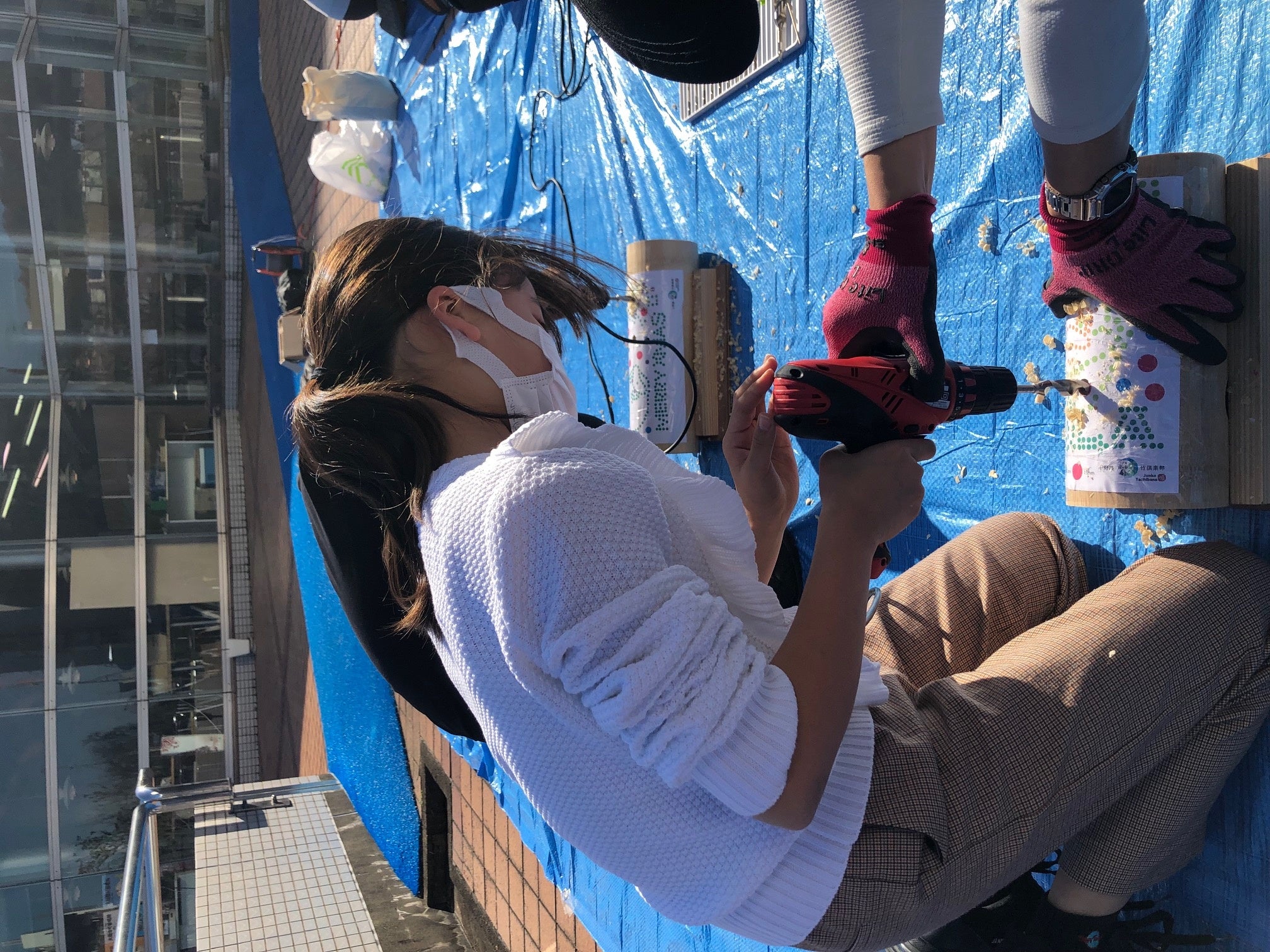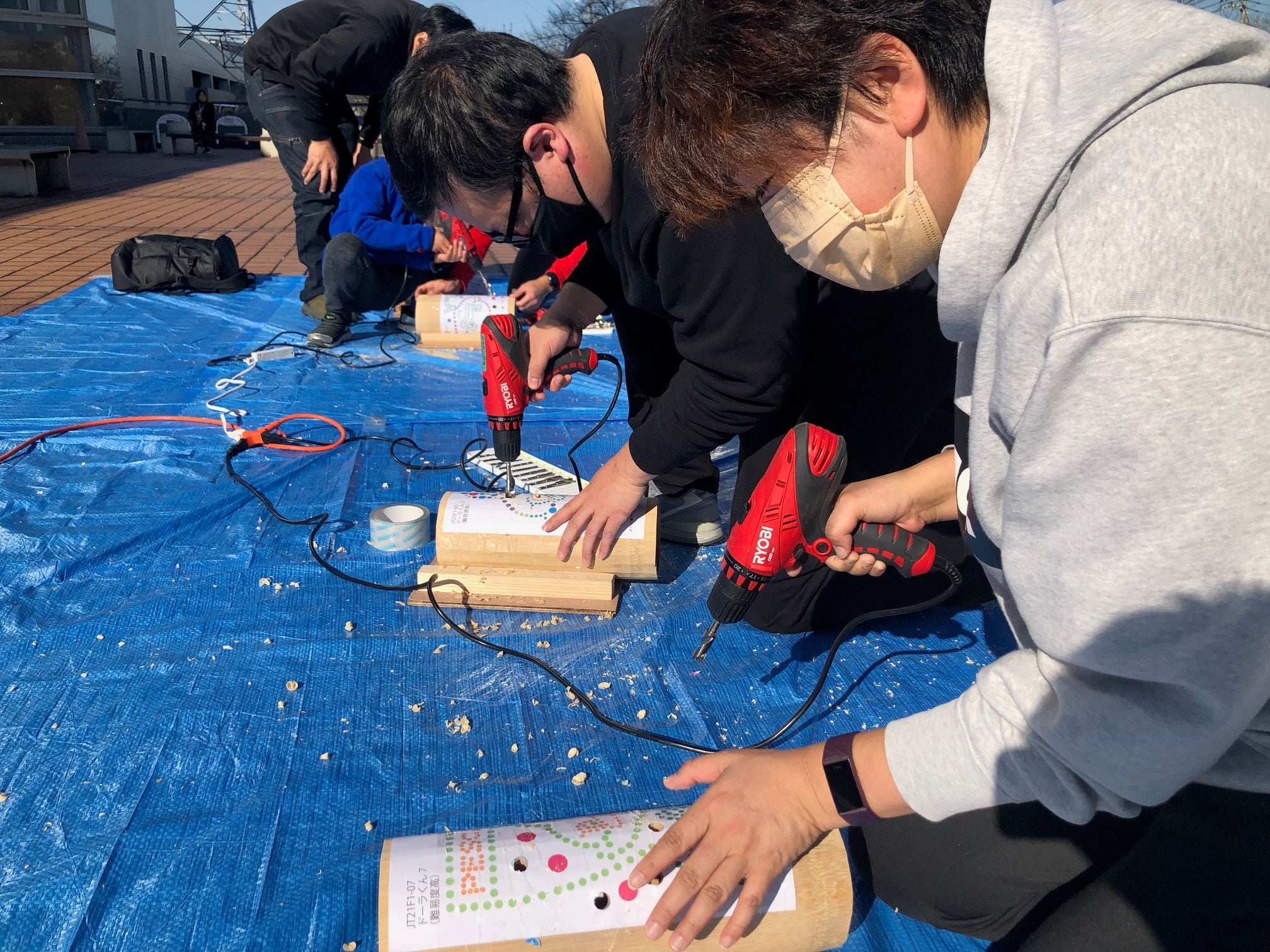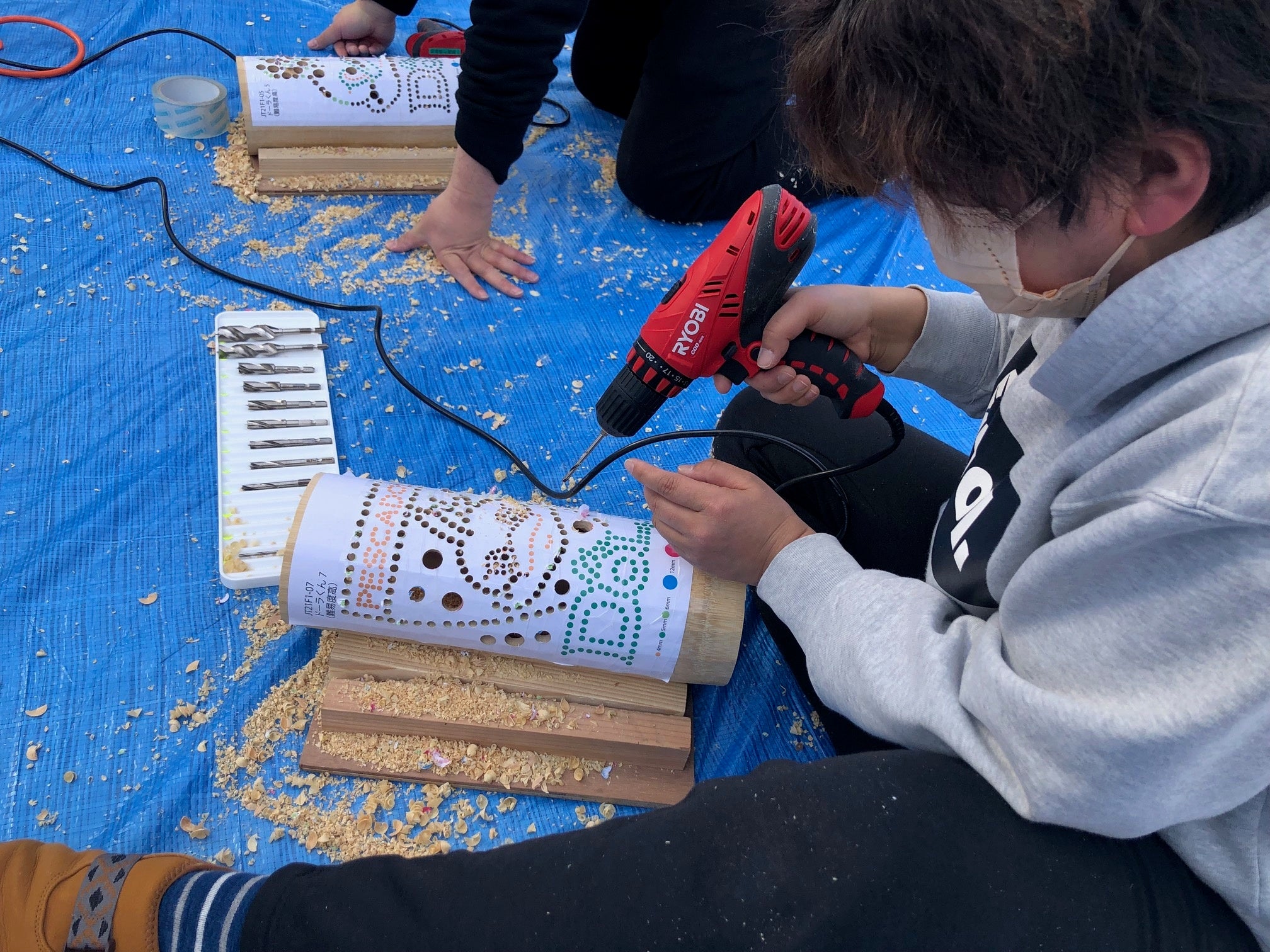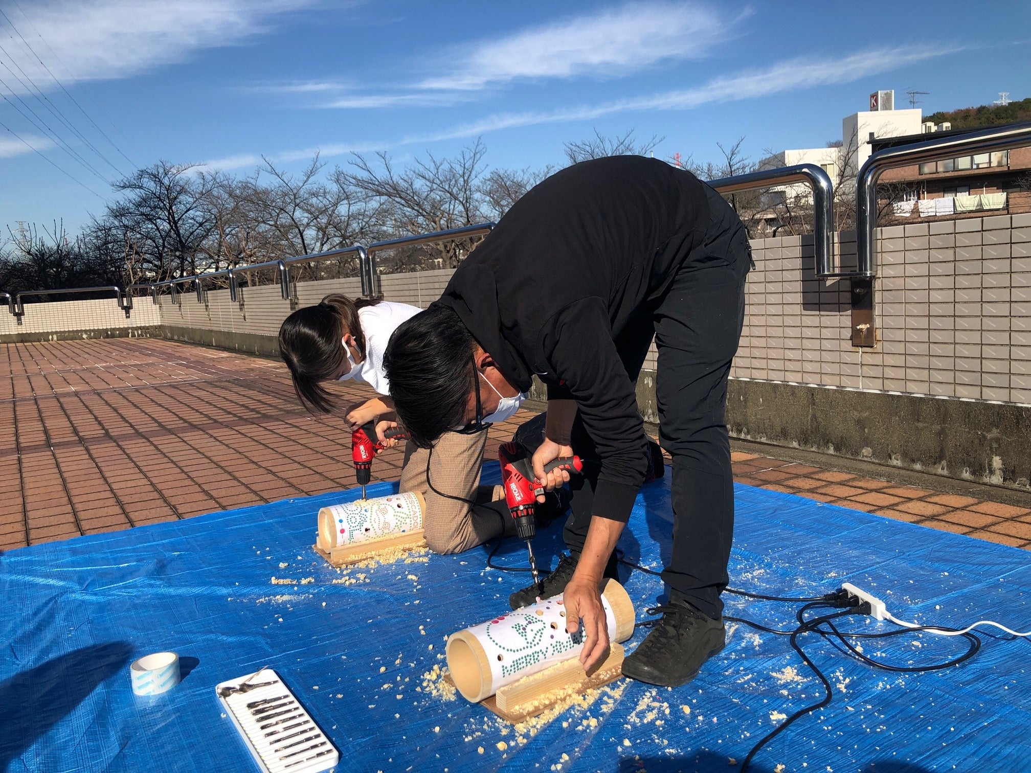 作業は町田市立総合体育館の中庭にて行います。竹にドリルで穴を開けるのですが、普段使わない道具の為、小野路竹倶楽部の平山さん、牛腸さんにご説明いただき参加者の皆様も一人で刃の付け替えや、穴あけに挑戦できました。