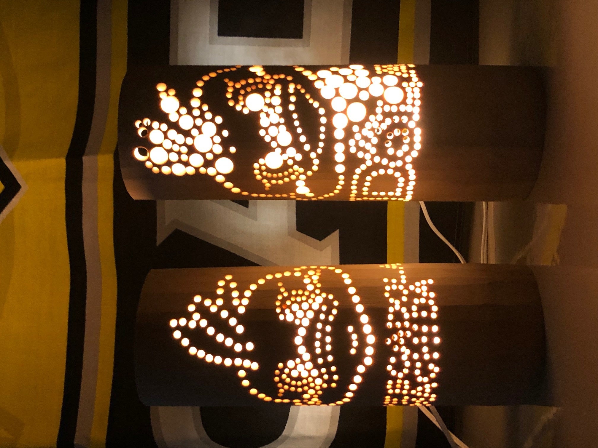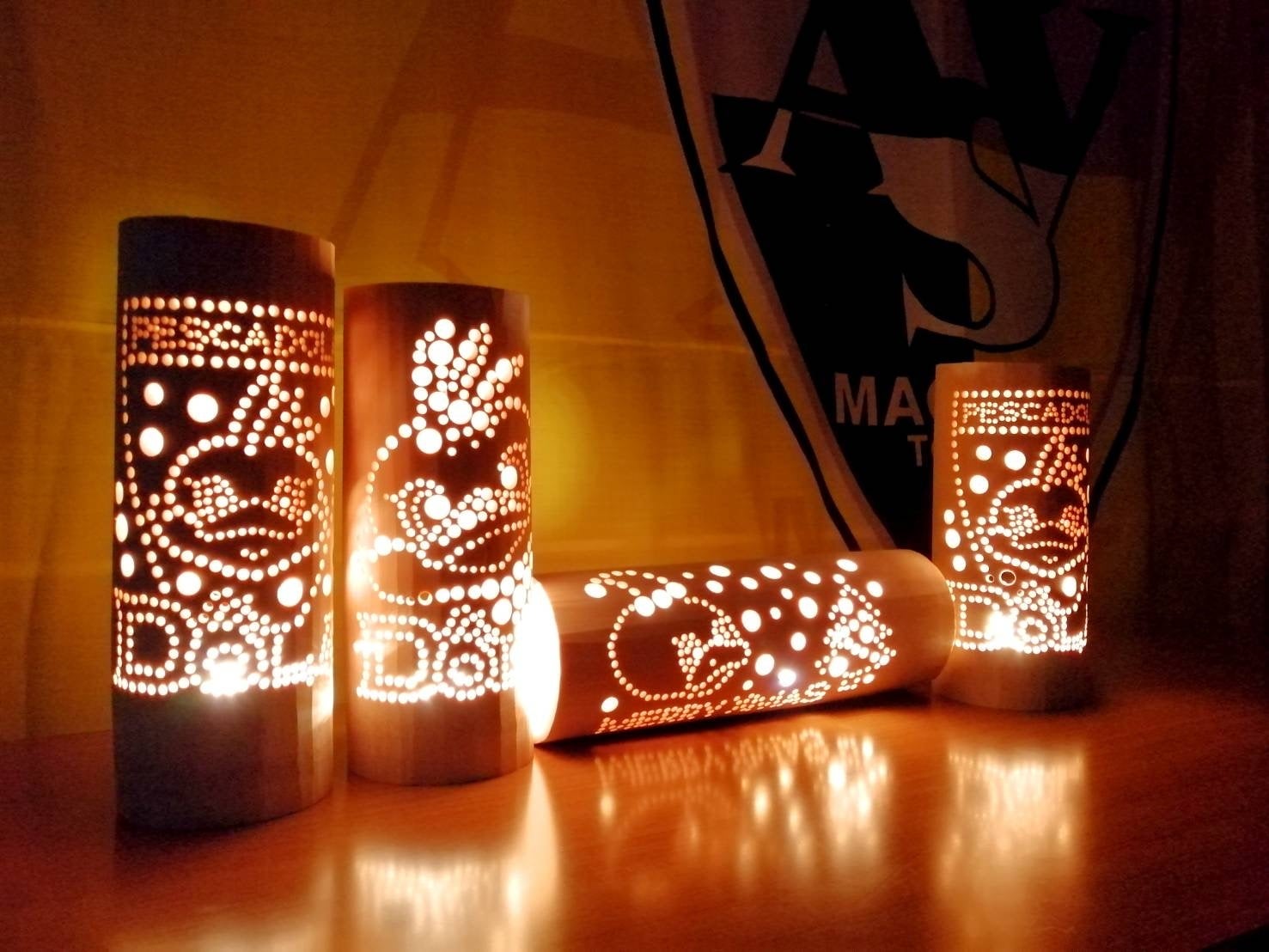 中にLEDライトを入れて、暗い部屋の中で灯しました。完成度の高いドーラ竹灯籠が続々と作成されました。