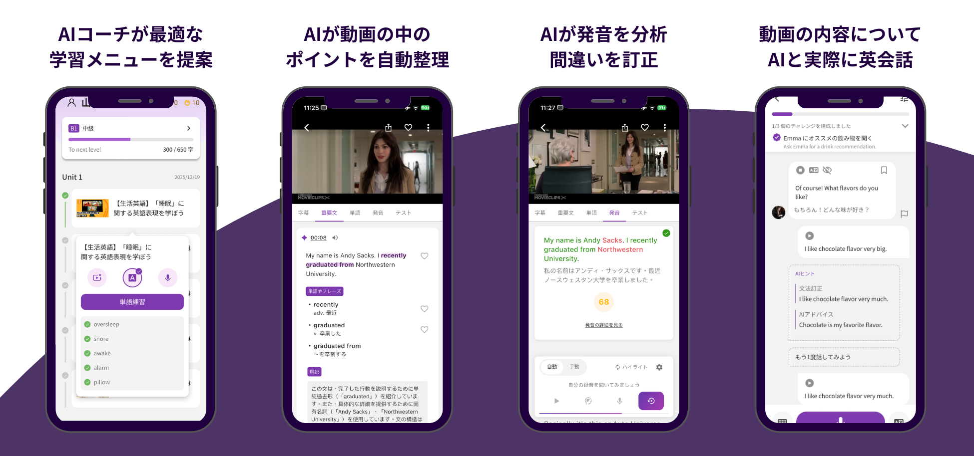 ネイティブの自然な発音でリスニング練習ができるほか、AI発音分析で発音・アクセントの課題を可視化。AIチャット機能では動画内容をもとにした実践的な会話練習も行えます。