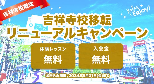 今回の移転リニューアルを記念して、ワンコイングリッシュ吉祥寺校ではお得に入会できる「リニューアルキャンペーン」を2024年3月1日(金)〜2024年5月31日(金)までの期間限定で実施いたします。この機会に諦めかけていた英会話、始めませんか?ぜひ体験レッスンへお越しください!