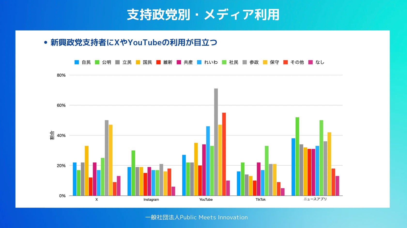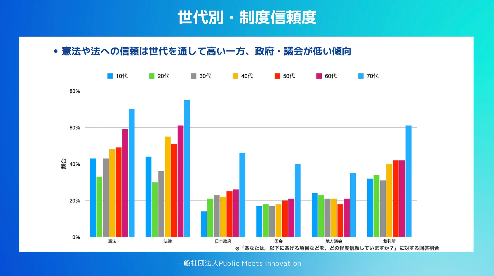 また、テレビは今も全世代に影響力があり、一方で法制度や憲法に対する信頼は根強いことが明らかになっています。確かに若年層を中心に新興メディアが台頭している側面はありますが、全体としては、既存の制度にある程度依存しながら政治と向き合っているのが現状です。