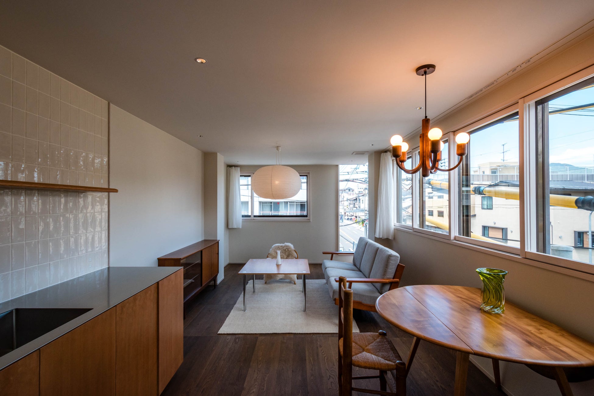 東山二条の交差点南西に位置する、かつては1階が焼き鳥店だったビンテージビルを八清が購入。新しくまちのシンボルとなるような空間利用を検討し、1階に飲食店のテナント、2階がシェアキッチン、3・4階+屋上がセカンドハウスシェア(3フロアで1組利用)に生まれ変わりました。