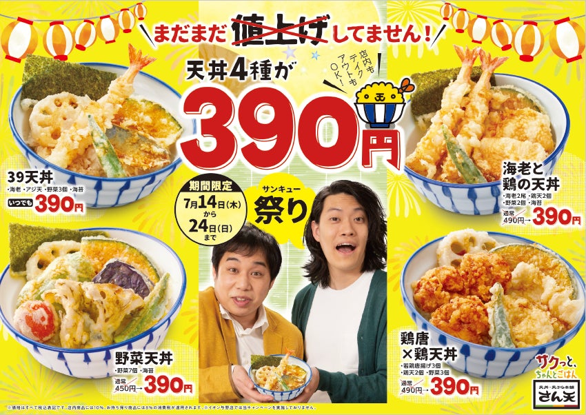 「まだまだ値上げしてません!」いつでも揚げたて天丼390円からの【天丼・天ぷら本舗 さん天】が7月14日(木)~7月24日(日)11日間≪天丼390円祭≫を開催!!