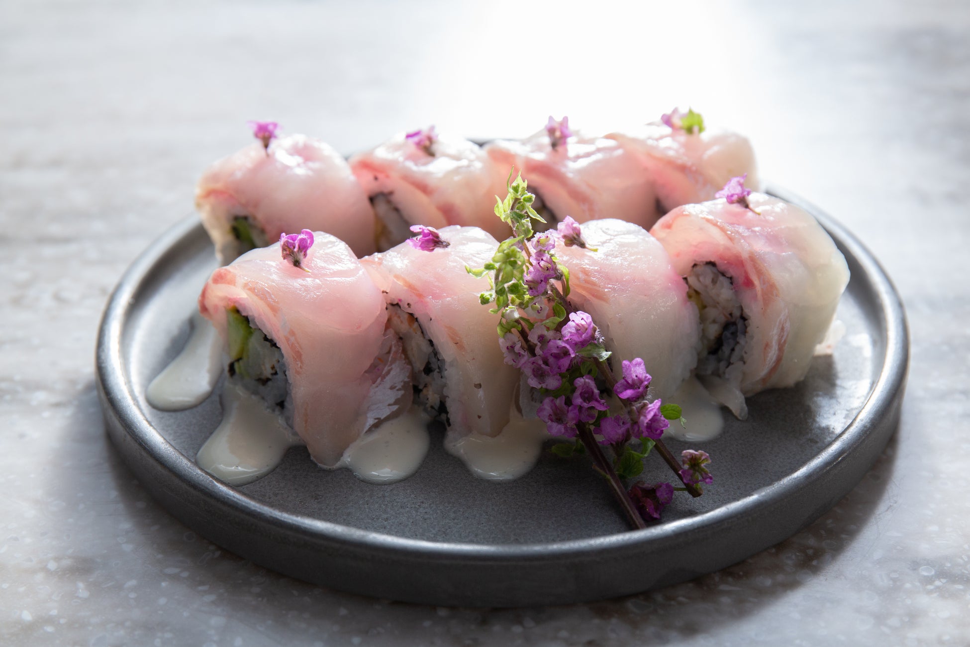 桜鯛を使ったスシロール。中には梅肉で和えた鯛とアボカドを包んでいます。柔らかな酸味が効いたクリーミーマヨソースで召し上がってください。