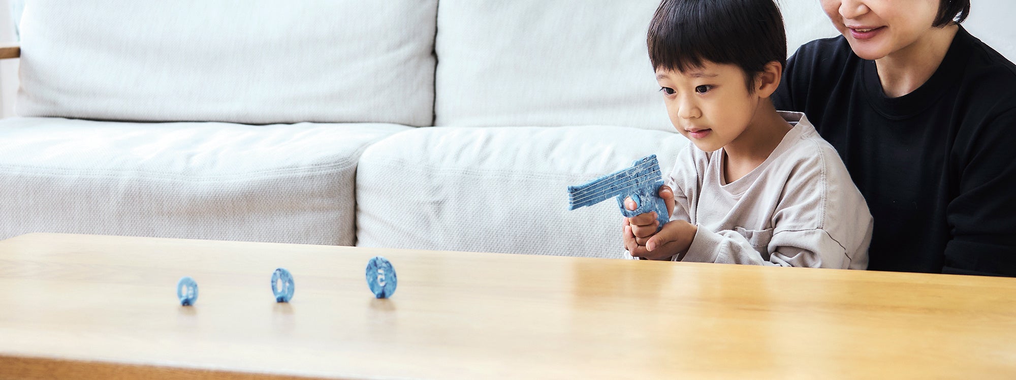 的として、おもちゃやお菓子の箱なども一緒に並べれば、お祭りの射的屋さんごっこもできます。