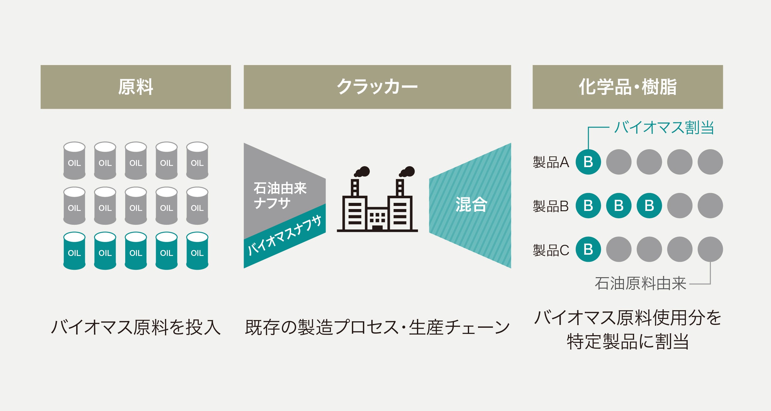 素材には、温暖化問題の解決のために、社会のバイオマス化を進める三井化学グループのブランド「BePLAYER®*」を導入。本来石油由来の成分であるプラスチックの原料を、バイオマス原料(植物など生物由来原料)に置き換え、さまざまなプラスチックのバイオマス化を進めています。「素材の素材」から見直すことで、カーボンニュートラルに向けて社会全体のバイオマス度向上を目指す新しい取り組みです。