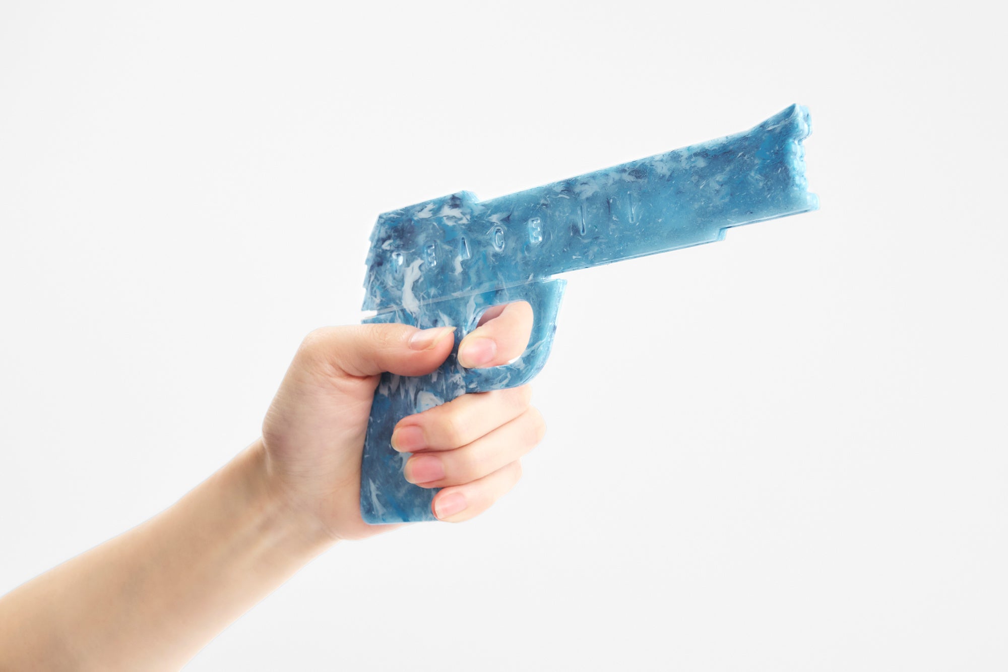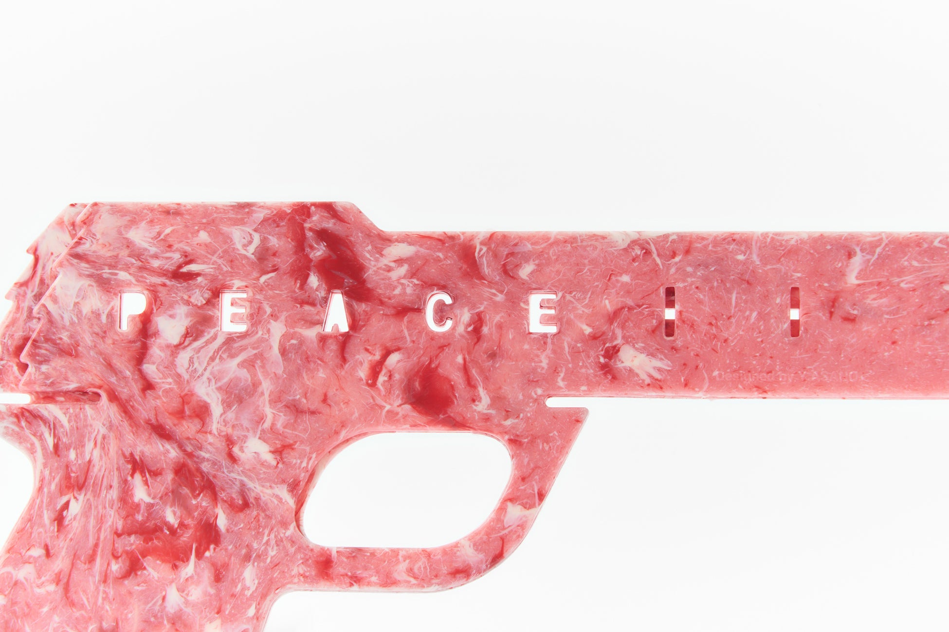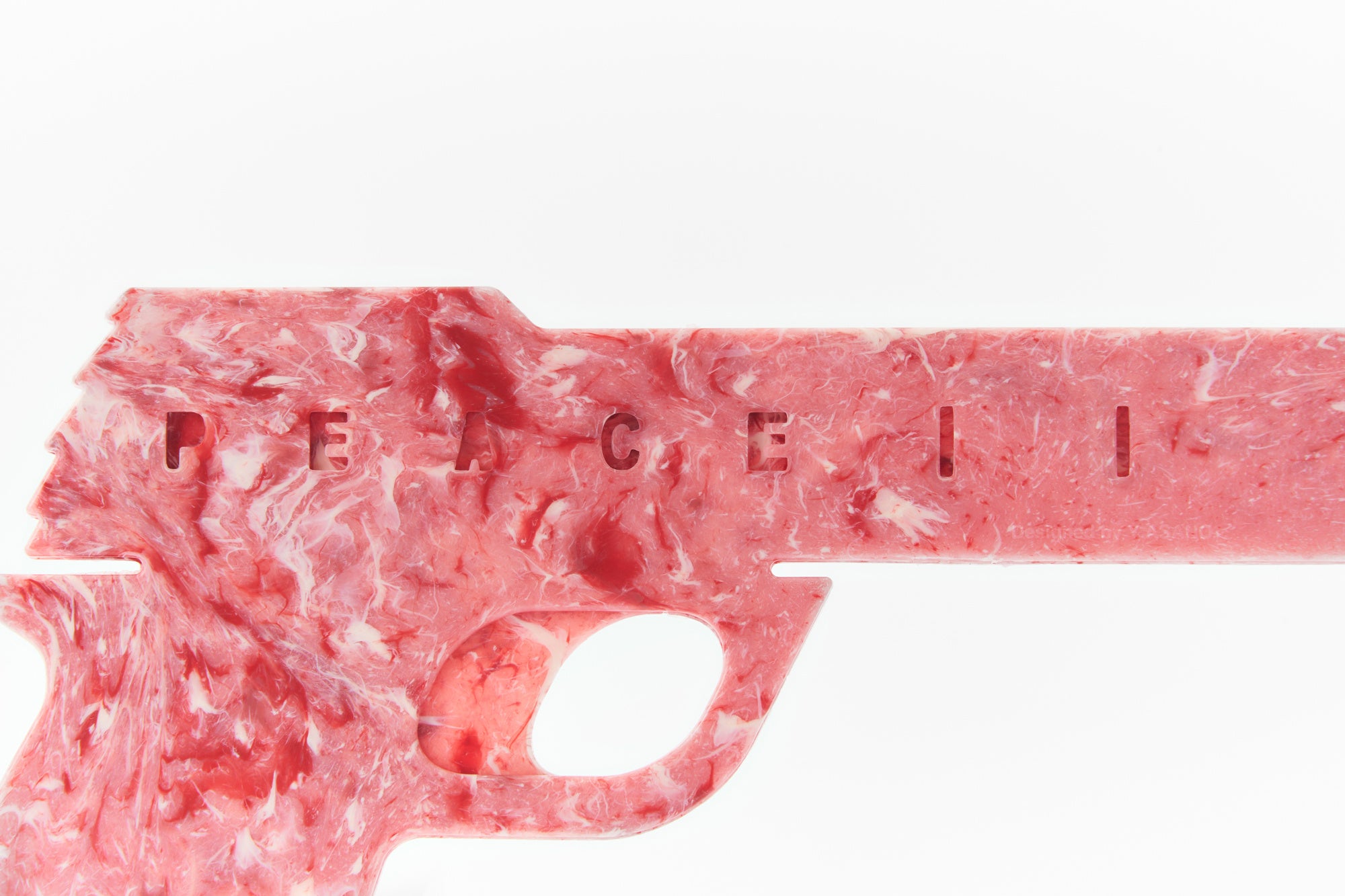 人と人が傷つけ合うことがないような世の中にしたいという思いをこめて、トリガーを引くと「PEACE」の文字が現れるようになっています。