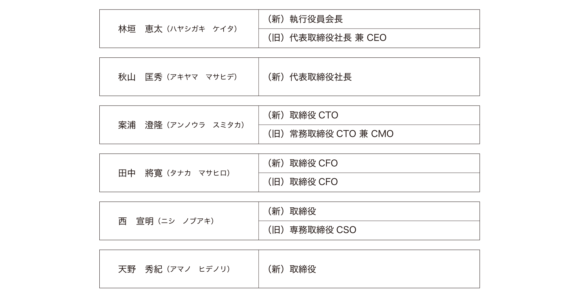 創業より代表取締役社長として当社を牽引してまいりました林垣恵太は会長へ、新たな代表取締役社長には秋山匡秀が就任いたしました。新体制のもと今後のさらなる発展に尽くしてまいります。
