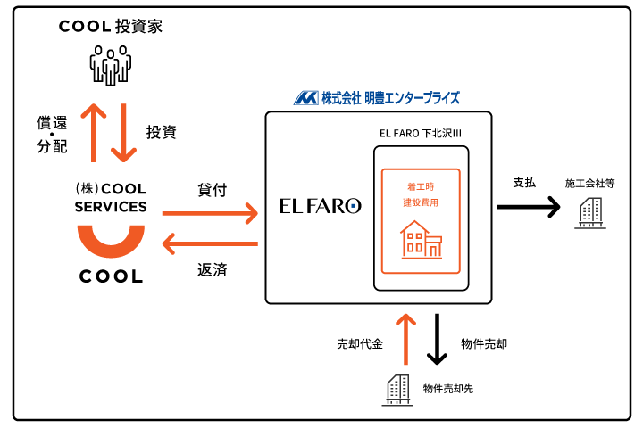 お客様より投資いただいた当ファンドの資金は、同じくZUUグループに属する貸金業者である株式会社COOL SERVICES(東京都世田谷区:代表取締役 伊藤 謙)から明豊エンタープライズに対して貸し付けられ、明豊エンタープライズが手掛ける「EL FARO 下北沢Ⅲ」の建築費用の一部として使用されます。
