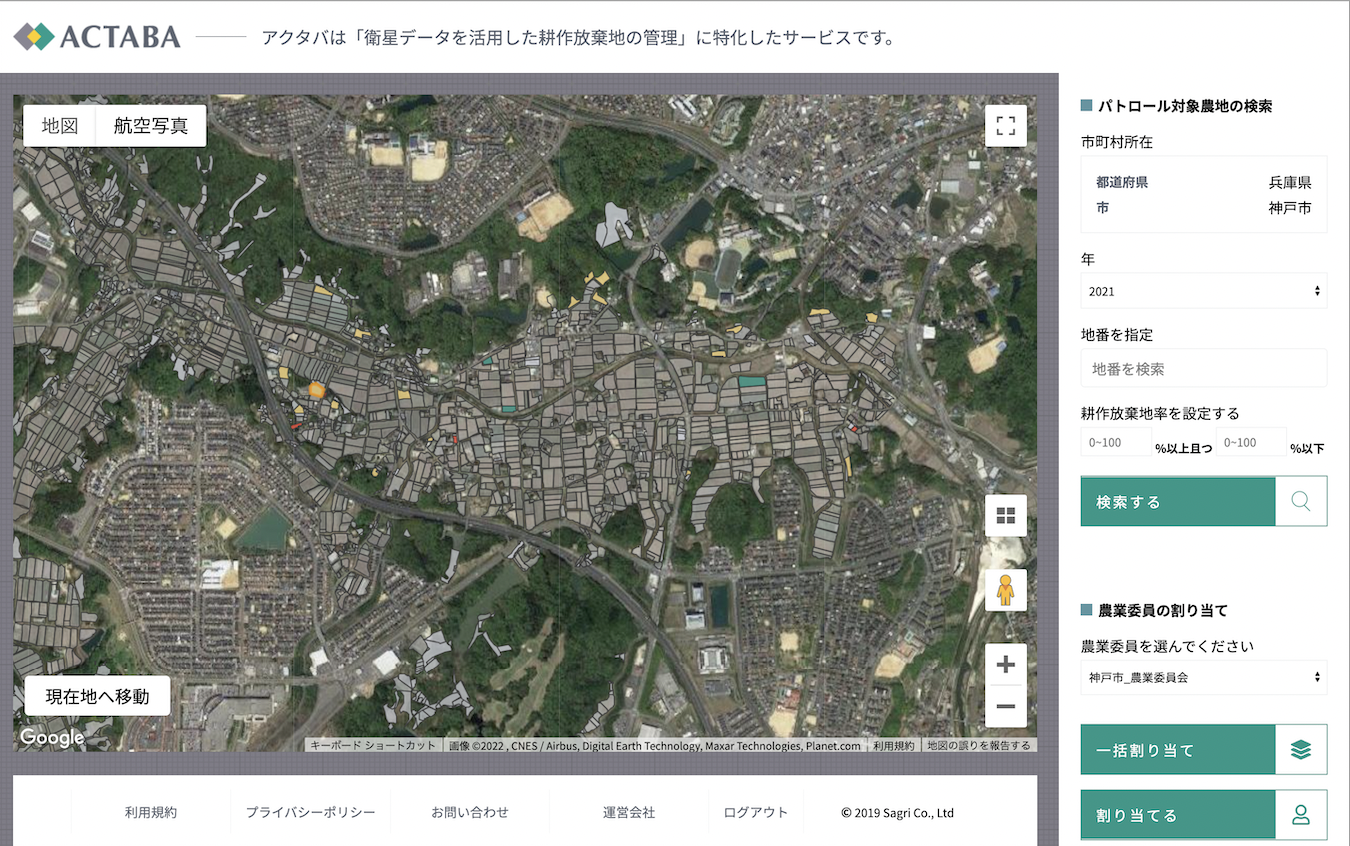 弊社は、衛星データとAIによる機械学習を掛け合わせ、耕作放棄地の検出を高精度で可能とし、農地管理をデジタル化できる耕作放棄地検出アプリACTABAの開発を行いました。現在、延べ40以上の市町村と実証を行っています。神戸市農業委員会との実証は関西地区で最初の実証事例となりました。令和4年度に、正式導入が進むと、関西で初めての導入事例となります。