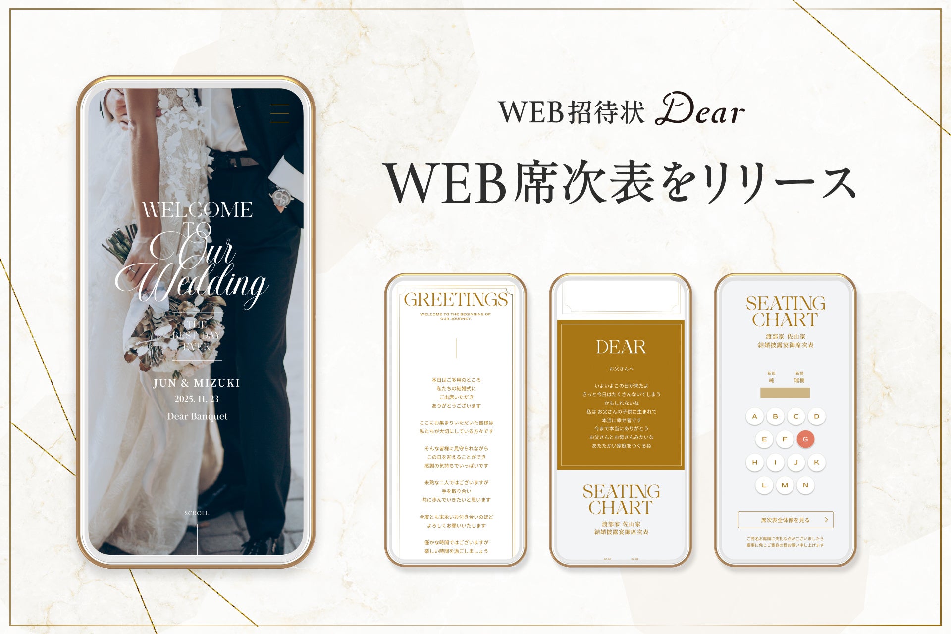 上質で洗練されたデザインで人気の『WEB招待状 Dear(ディア)』は、新機能「WEB席次表」をリリースいたしました。一般販売に先駆け、ブライダル事業者向けに先行販売いたします。