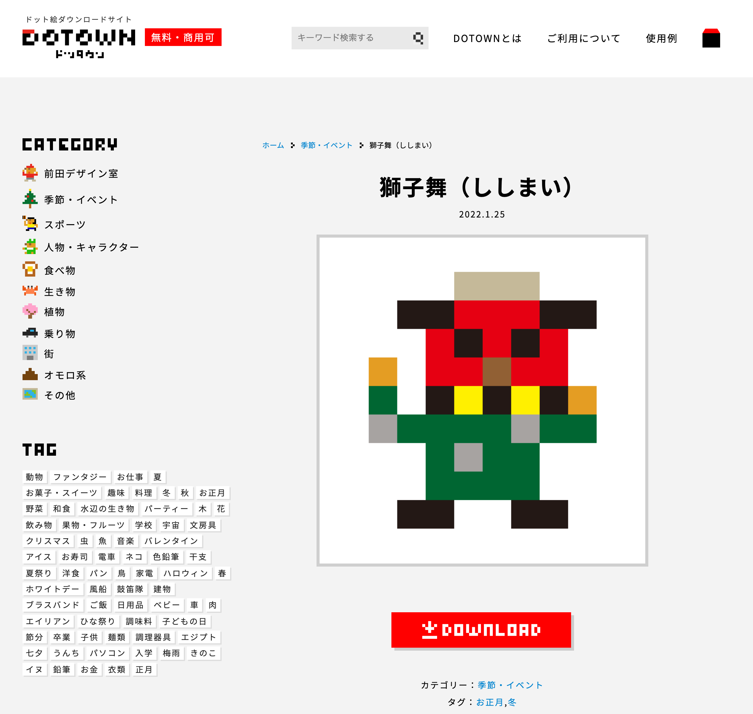「DOTOWN(ドッタウン)」は、粗ドット素材をPNG形式でダウンロードできるWebサイトです。全素材、無料かつ商用利用も可能です。