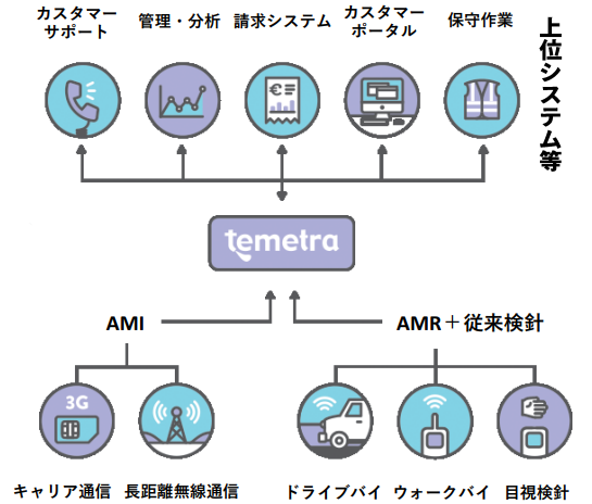 ・Temetra は、世界中で使用されている水道メーターのデータ一括検針の集中管理ソリューションで、 水道スマートメーターの所在地・顧客管理、時間帯別のエリア流量管理、事業所区分 別の使用傾向、検針ルートの提案などで、従来の目視検針、AMR、固定ネットワーク AMI に至るまで、メーターの検針値を収集、保存、分析するためのソフトウェアをクラウドで提供しています。