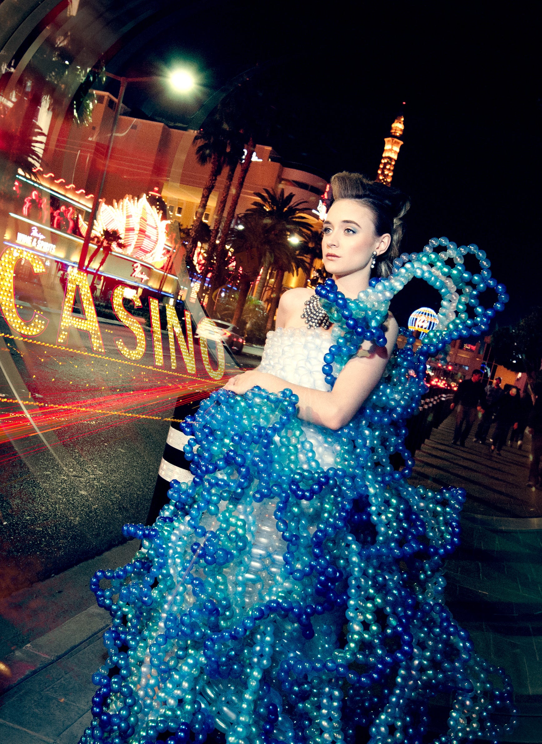 バルーンを2枚重ねたり、透明なバルーンに絵の具で着色することで独特の色や質感を生み出し、そこから一つひとつを捻り上げて形作ることで、唯一無二のファッションに昇華させました。