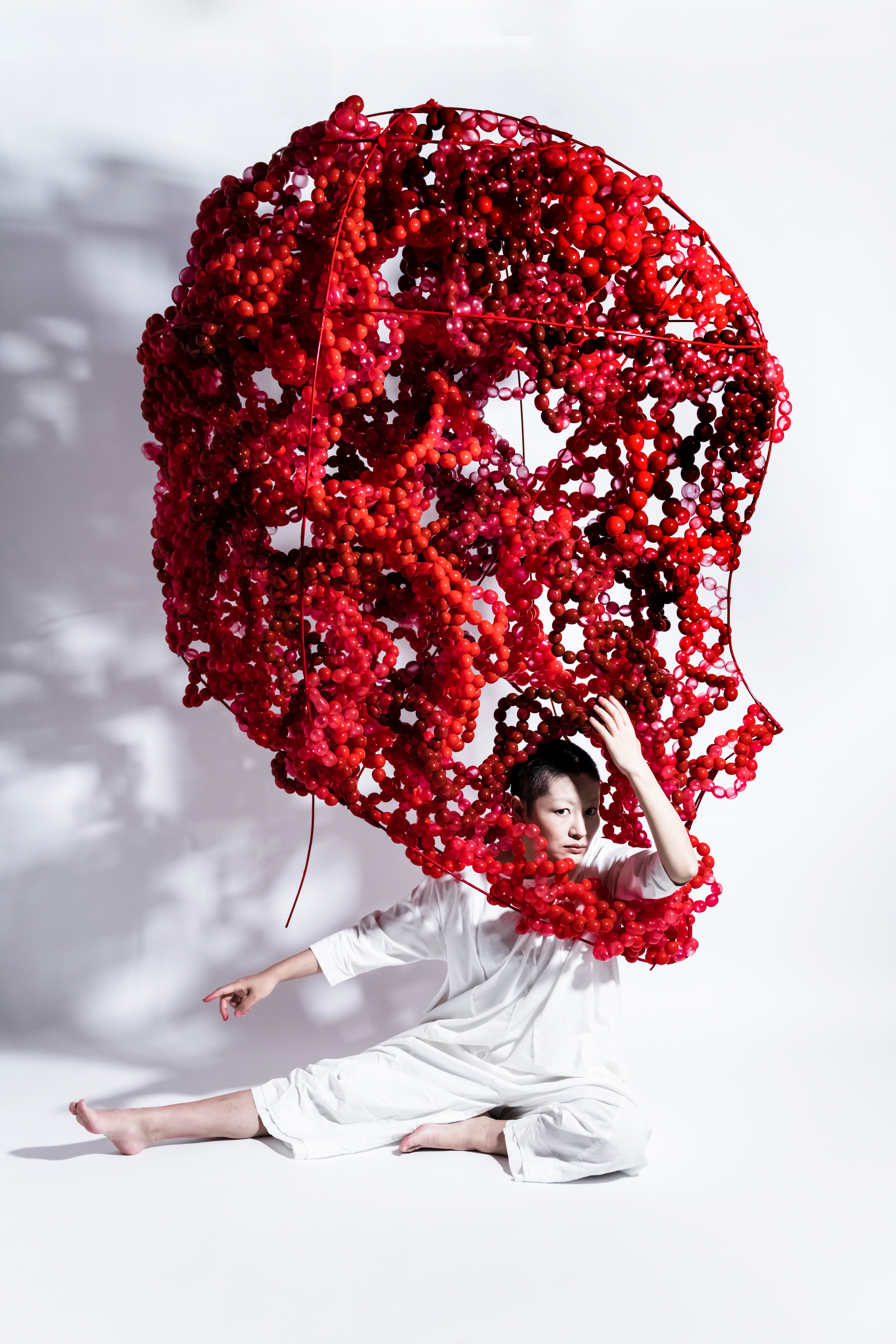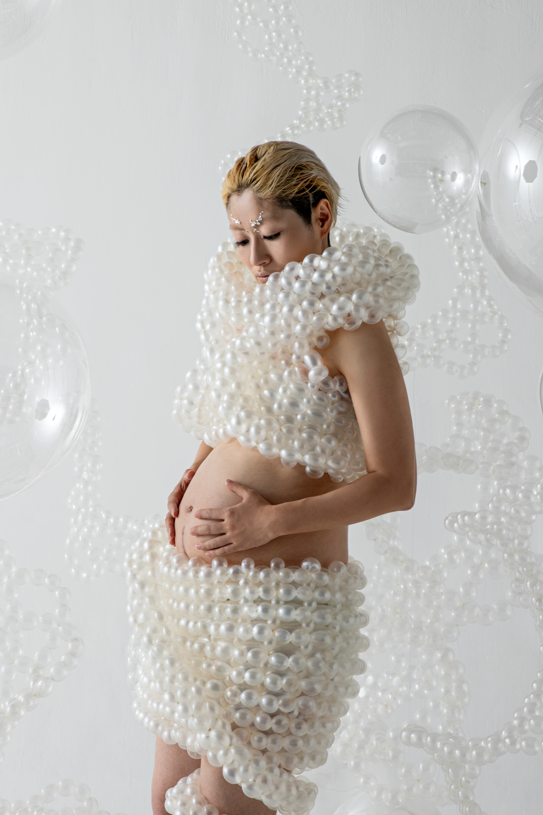 バルーンという一時性のある素材に、命の儚さと美しさを重ね合わせ、強さを内包したウェアラブルアートを制作。