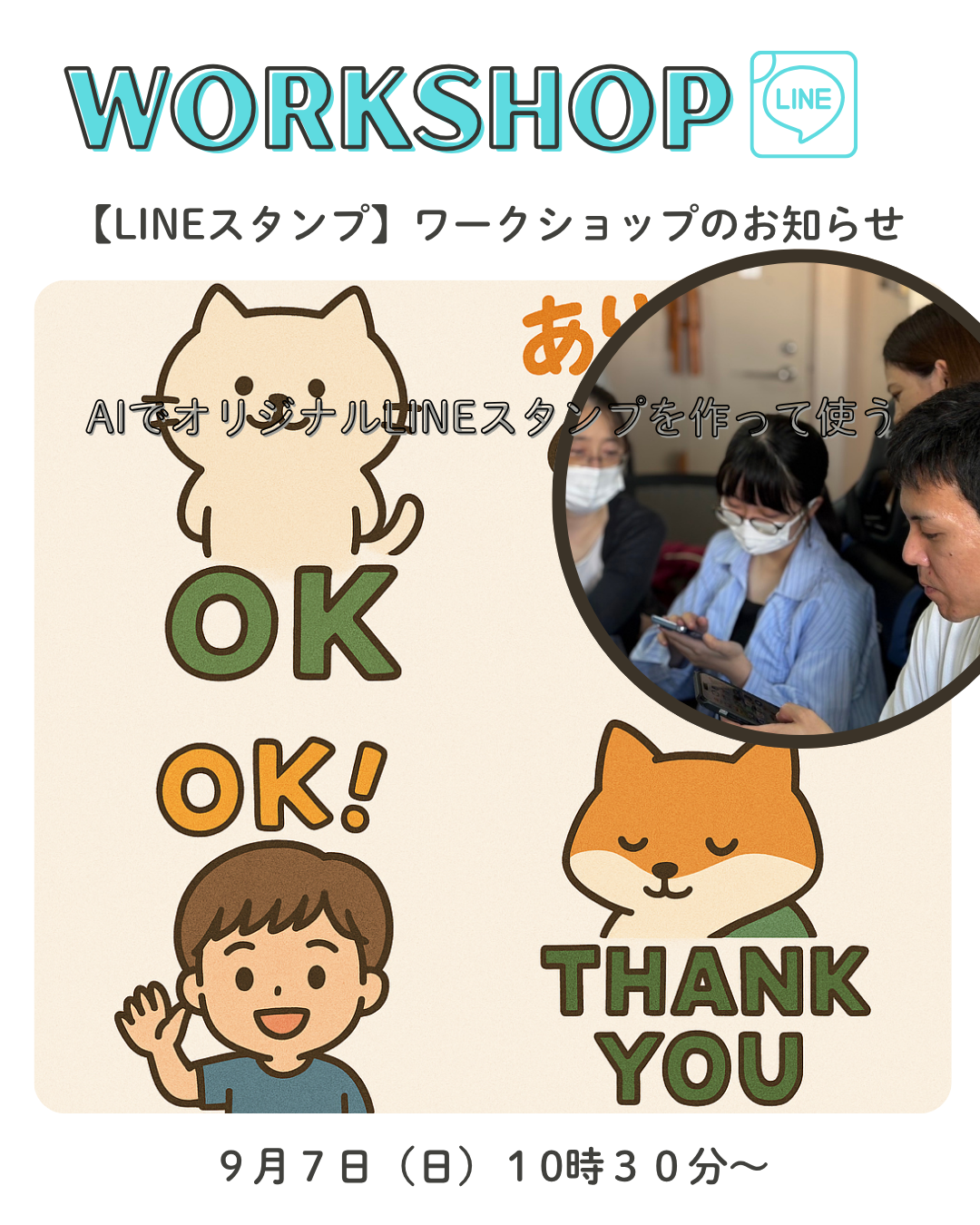 運営しているワークショップが大好評につき、要望にお答えしてAIを学びながらLINEスタンプを作るワークショップを9月より定期的に開催致します。