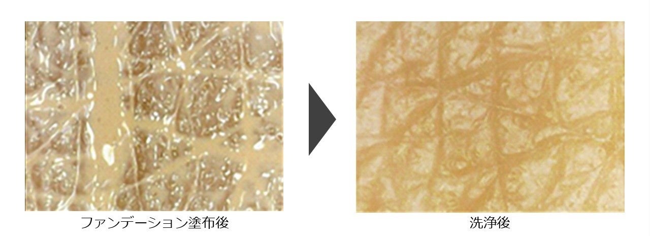 ※5…試験方法 手の甲にファンデーションを塗布し傾斜板(傾斜角度25度)に乗せ、吐水し、ファンデーションの落ち具合を確認する。吐水条件:ミスト水形:動水圧0.1MPa(流量3.6L/min)吐水距離:スクリーン~傾斜台間15cm