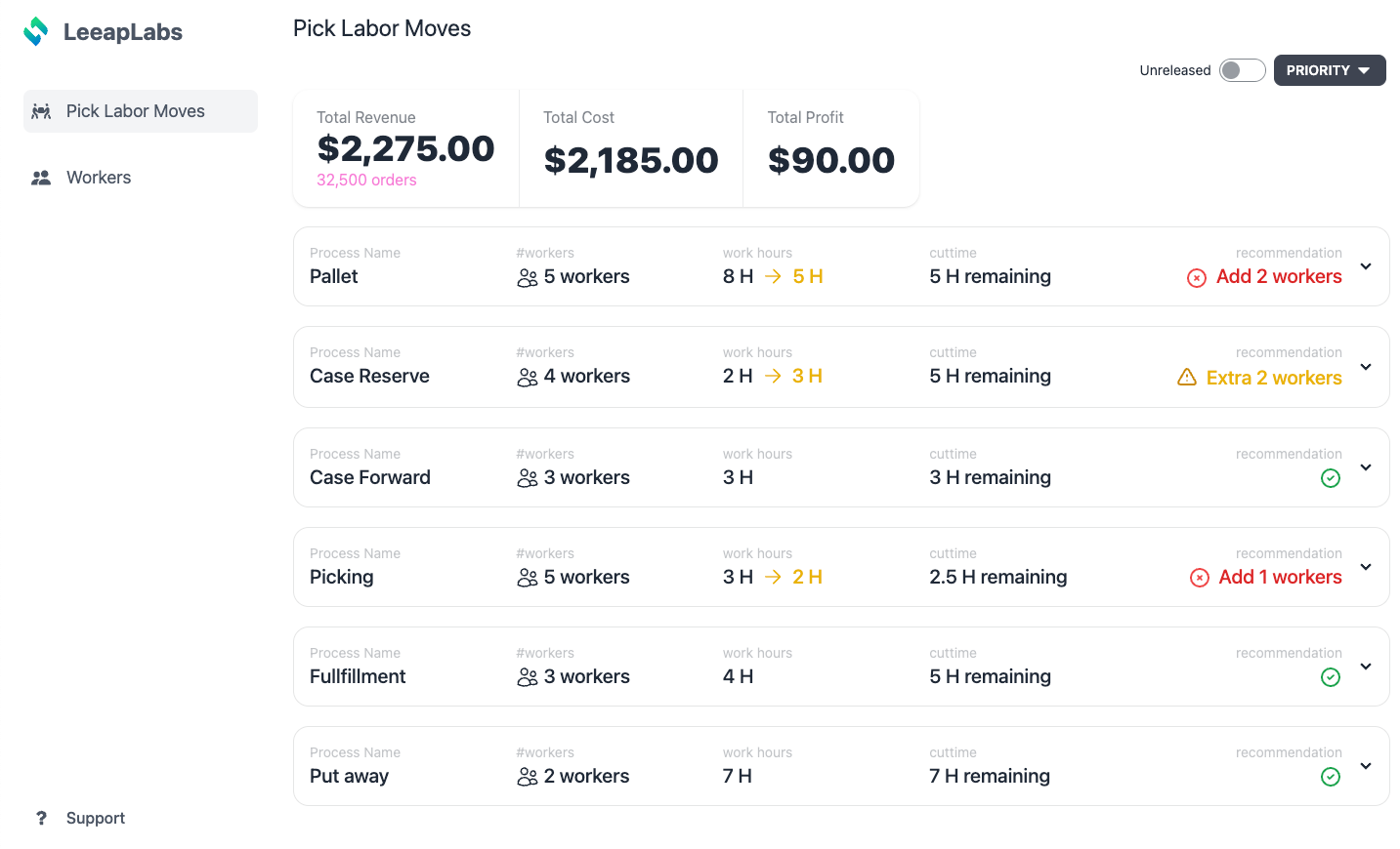 倉庫運用は現場リーダーの勘と経験に頼りがちですが「”レベルプランナー・プラットフォーム”の倉庫モジュール」ではこれまでの過去データをAIモデルが考慮・学習し、正確な作業完了予測時間を推定。
