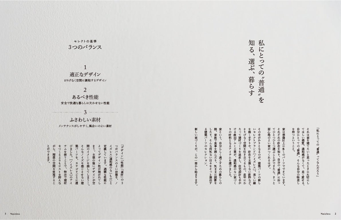 森田アルミ工業株式会社(所在地:大阪府阪南市、代表取締役:森田和信)は、建築パーツのセレクトブランド Noizless[ノイズレス]を9月30日にリリースいたしました。その第一弾として、書籍「Noizless VOL.01」を発刊いたします。