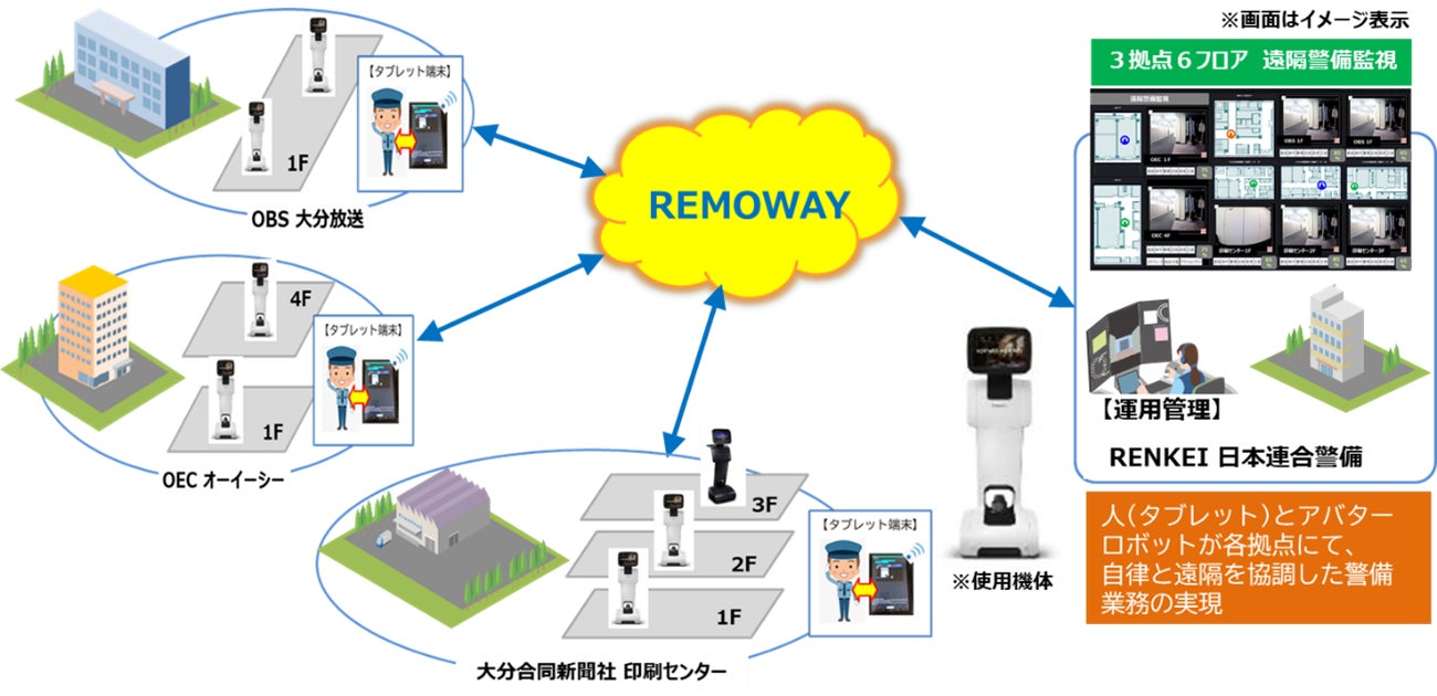 同時に施設警備運用を実施。大分放送内の2台のアバターについては、警備員との協調業務の様子を披露。