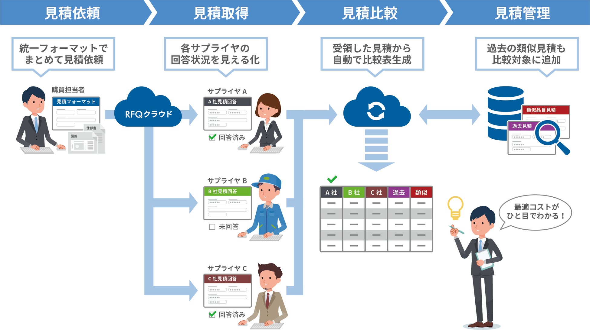 「RFQクラウド(R)」は購買調達における見積業務をWEB上で完結し、過去の見積価格データの蓄積・共有を可能にするクラウド型見積システムです。製造業の調達業においてコストや納期を決定する重要なプロセスである「見積もり見積り」に特化した業界初のクラウドサービスとして2019年10月にリリースし、見積業務に課題を抱える多くの企業で本製品を採用いただいています。