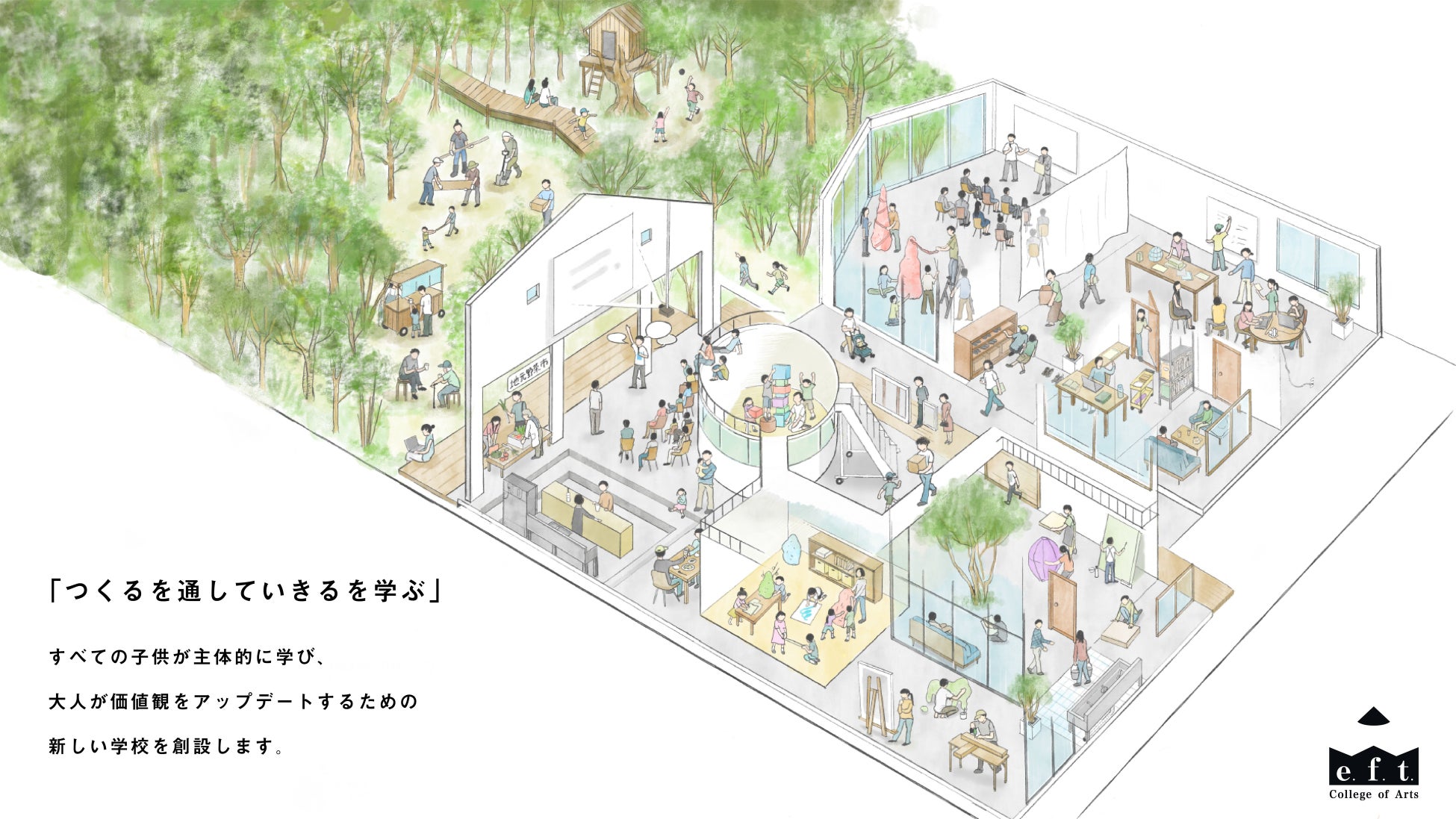 2027年4月開学予定の「e.f.t. College of Arts」は、「すべての子どもが主体的に学び、大人が価値観をアップデートする仕組み」を備えた、全く新しい学校です。