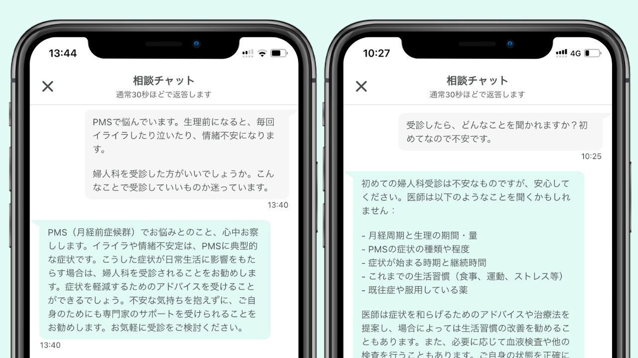 産婦人科医監修の相談チャット機能は、過去にケアミーの利用者から寄せられた1万件以上の相談データおよび生成AIを活用し、月経トラブル、PMS、妊活、不妊、婦人科系疾患など女性の健康に関わる相談に幅広く対応します。24時間いつでも利用可能で、利用者からの相談に約30秒で返答。これにより、「受診すべきかどうか分からない」「受診したが、医師に聞きたいことを質問できなかった」といった不安を迅速に解消し、多くの働く女性にご活用いただいています。
