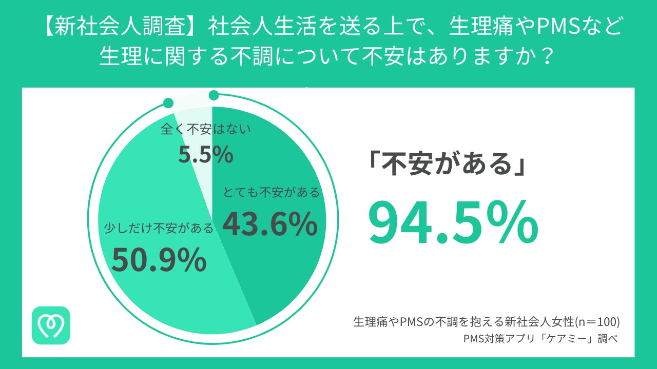 生理痛やPMSの不調を抱える新社会人女性100名に対し、社会人生活を送る上で、生理に関する不調について不安があるか尋ねたところ、43.6%が「とても不安がある」、50.9%が「少し不安がある」と回答。9割以上が新生活に不安を抱えていることが分かりました。