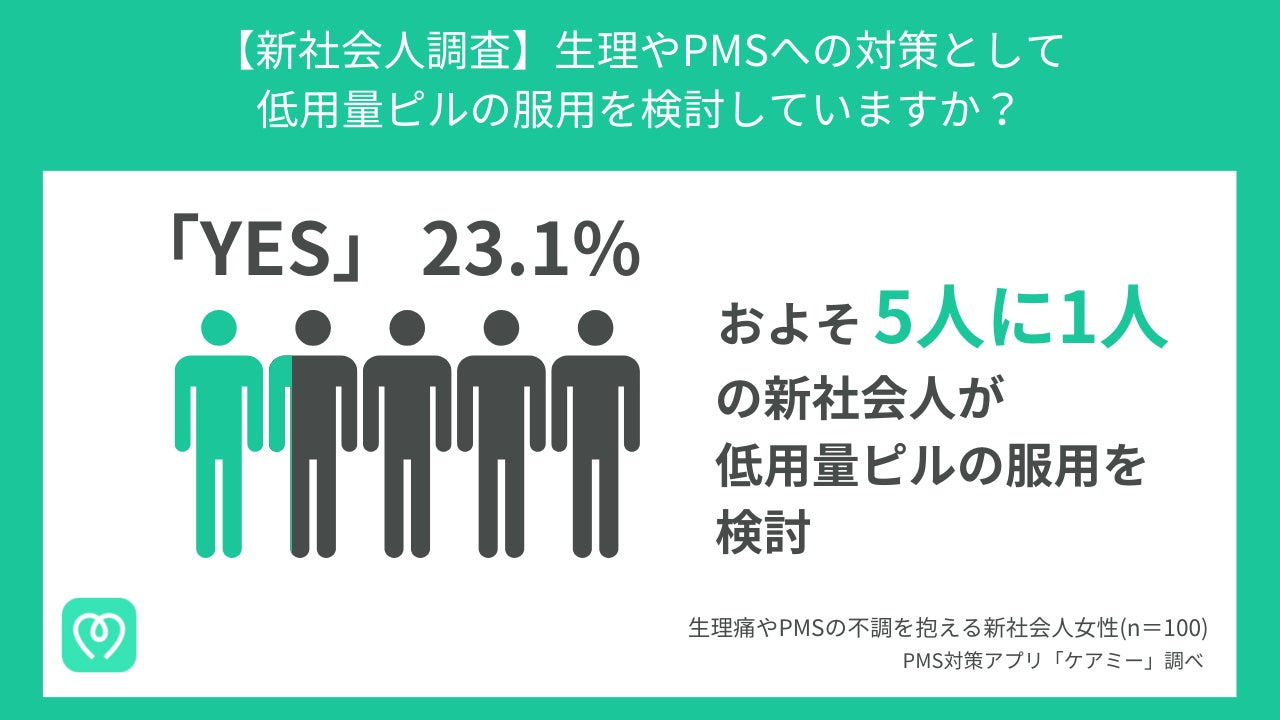 さらに、生理痛やPMSへの対策として、低用量ピルの服用を検討している新社会人の割合は23.1%でした。日本のピル服用率は2.9%(※4)ですが、生理痛やPMSの不調を抱える新社会人では、約5人に1人が低用量ピルに関心を持っています。生理に関する不調は我慢してしまいがちですが、少しでも不調を感じたら婦人科を受診し、適切な治療を受けることが重要です。