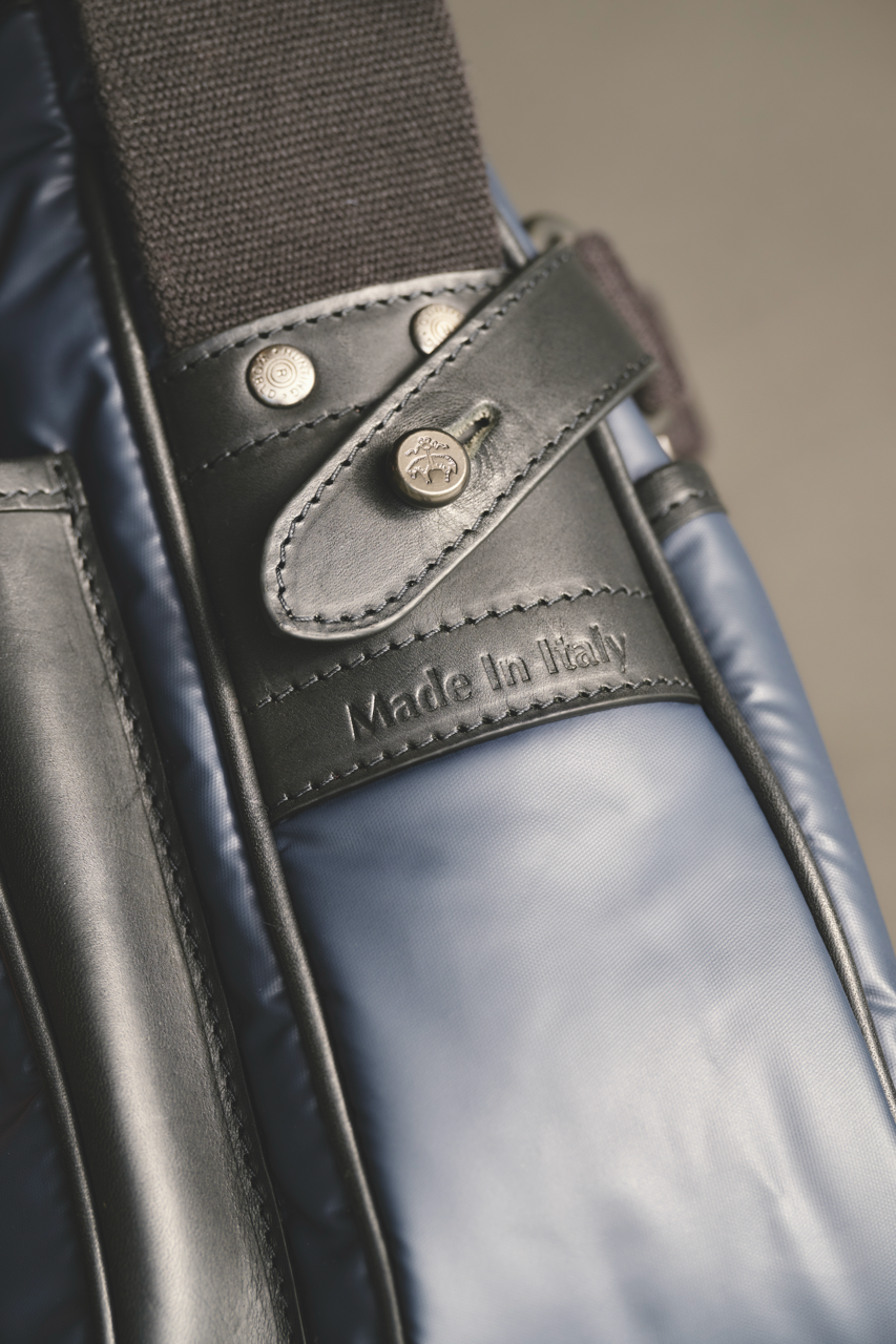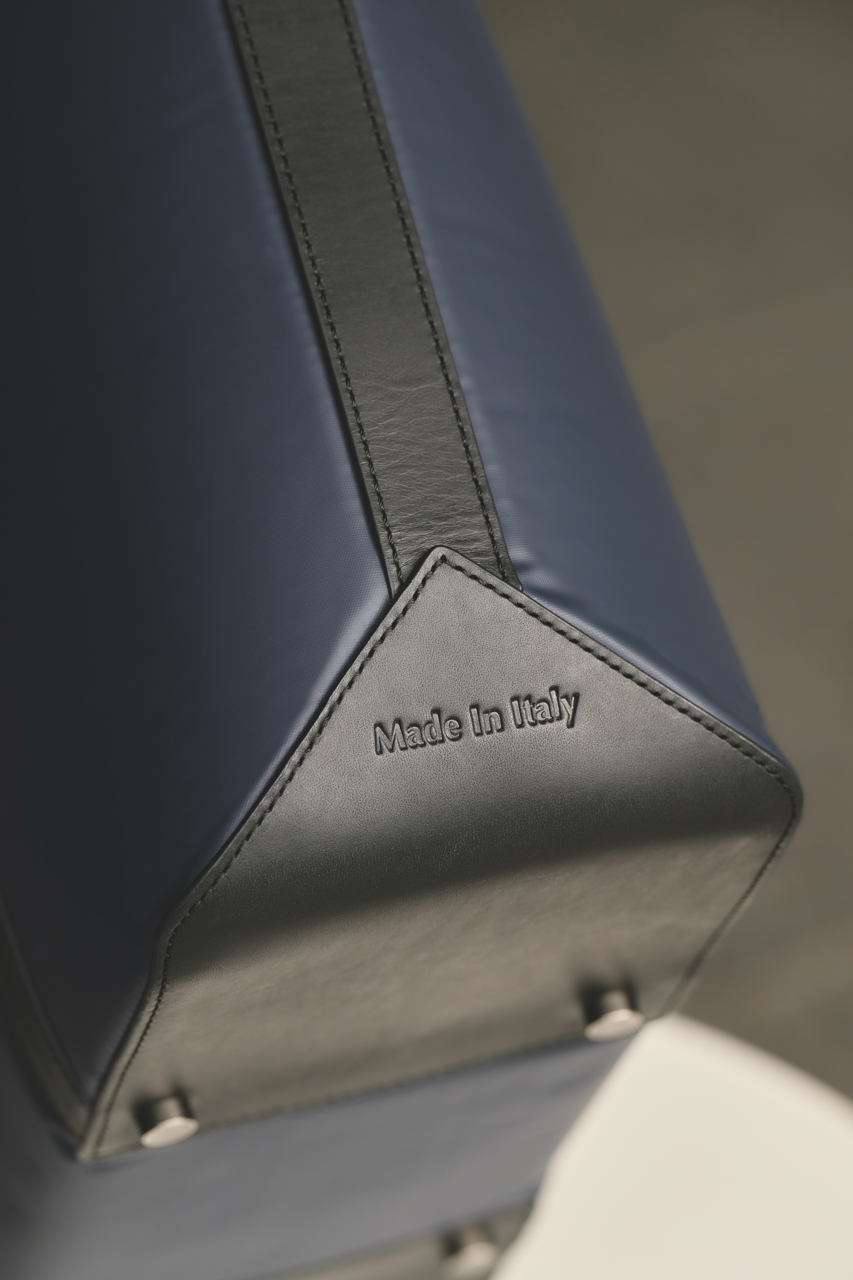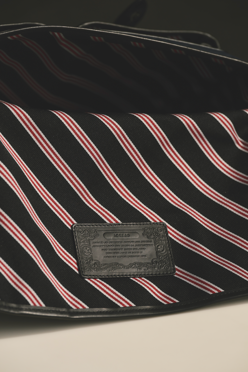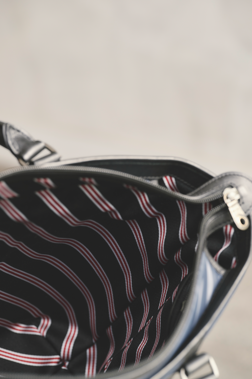 「ブルックス ブラザーズ」のブレザーを想起させるネイビーカラーにブラックレザーのトリミング、そして重厚感のあるメタルパーツのコンビネーションが、シックでエレガントな表情をつくり上げています。